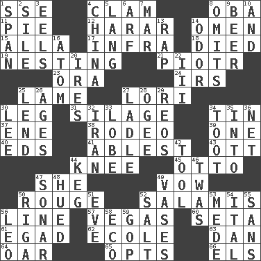 ACROSS 1. Compass dir. 4. Dollar (slang) 8. Chief or king in Benin or Nigeria 11. Sliced dessert 12. Ethiopian city, capital of Harari 14. Presage 15. Silent film actress Nazimova 17. Kind of red light 18. Passed on 19. Nestling 21. Peter (Polish) 23. Mouth or opening 24. Big collection agency 25. Unable to walk 27. Australian parrot (variant) 30. Part of a journey 31. Fodder prepared in a silo 34. Shallow baking pan 37. Compass dir. 38. Cowboy competition 39. Single 40. Begley and Asner 41. Most capable 43. Baseball player Mel 44. Leg joint 45. "Beetle Bailey" pooch 47. A female animal or person 49. Solemn pledge 50. Makeup applied to the cheeks 52. Deli grouping 56. Actor's bit 57. Viva Las _ 60. Bristle 61. Mild oath 62. Learning spot: Fr. 63. Daniel's nick name 64. Rowing implement 65. Elects 66. Raised railways DOWN 1. Connect, as a bridge 2. Filth; sediment 3. Snakelike fish 4. Large country 5. Austrian-born American filmmaker Fritz 6. Sandy's bark 7. Third mo. 8. Leaves out 9. Fermented drink made from hops 10. Plus 13. Strike 14. Aroma 16. Smallest unit of an element 20. Angers 22. One more than two 25. Grant temporary use of 26. Eons 27. Dipping utensil 28. Double curve, resembling the letter S 29. Vintage cars 30. Area sheltered from the wind 32. SW Asia republic 33. Ear part 34. A blast of a horn 35. To the inside or interior of 36. Remaining after all deductions 42. Instrument 44. Cask 46. It was, poetically 47. Underwater navigation system 48. Took on color 49. Flower holders 50. Port city in Latvia 51. First lady 52. Table seasoning 53. Ancient Persian 54. Slanted text style (abbr.) 55. Without 56. Lion 58. Environmental prefix 59. Republican Party