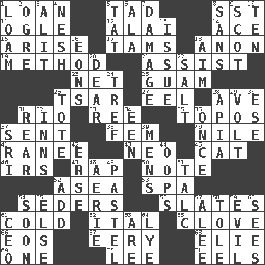 ACROSS 1. Grant temporary use of 5. Bit 8. Fast jet (abbr.) 11. Stare at amorously 12. Jai _ 14. Adept person 15. Originate 17. Scottish caps 18. At once, immediately (arch.) 19. Mode 21. Help 23. Remaining after all deductions 25. Island territory of the United States 26. Russian ruler of old 27. Snakelike fish 28. "___ Maria" 31. _ de Janeiro 33. To riddle 35. Traditional theme or motif 37. Emitted 38. Opposite of masc. 40. "Death on the ____" 41. The wife of a rajah (variant) 43. Modern: prefix 45. Domesticated feline 46. Big collection agency 47. Strike 50. Brief written record 52. Toward the sea 53. Health resort 54. Spring feasts 56. Chalkboards 61. Having a low temperature 62. Slanted text style (abbr.) 65. Garlic unit 66. Greek goddess of the dawn 67. Suggestive of the supernatural 68. Writer Wiesel 69. Single 70. Area sheltered from the wind 71. Snakelike fish DOWN 1. Rich soil 2. Legendary monster 3. Came down and settled, as after flight 4. Tender 5. Make lace 6. Insect wing 7. Break 8. Without 9. Highlander 10. Nine, plus one 13. Come out of 16. Immeasurably long periods of time 18. Direct toward a target or goal 20. Letter starter 22. Table seasoning 24. Unclean, religiously 26. Lug 28. Capital of Western Samoa 29. Electrical Unit 30. Compass dir. 31. Bring up, as a child 32. Restaurants 34. Car or cant ending 36. At one time in the past 37. _ Lanka 39. Not women's 42. Celtic language 44. I made a mistake 48. Nest on high 49. Soft color 51. Baby powder 52. Say or write further 54. Within a short period 55. Otherwise 57. Toward shelter 58. Lacquered or enameled metalware 59. Morally bad or wrong 60. Observes 61. Corporate head (abbr.) 63. "We ___ not amused" (Victoria) 64. Potassium hydroxide