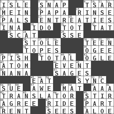 ACROSS 1. Small island 5. Fastener 9. Russian ruler of old 13. Count _ (2 wds.) 14. Dad 15. Wash lightly 16. Friends 17. Pleas 19. _ tizzy (2 wds.) 20. Wedding promise 21. Small child 22. Make lace 23. Get outta here! 25. Compass dir. 26. Fur scarf 30. Adolescent 34. Drinks excessively 35. Double curve, resembling the letter S 36. Expression of disdain 39. "_____ Recall" 42. Stare at amorously 43. Tiny particle 44. Happening 46. Grandmother 47. Gurus 48. Ingest 51. Synchronize (abbr.) 54. Take to court 57. Deep reverence 58. Floor protector 60. American Automobile Association (abbr.) 62. Interpreter 65. Use a swizzle stick 66. Match 67. Travel on an animal 68. Role in a play 69. Monthly bill 70. Perceives with the eye 71. _ vera DOWN 1. Body of Kaffir warriors 2. Seines 3. Pale purple color 4. Followers of ems 5. Hurried 6. Billionth: prefix 7. Fitting 8. Actors' quests 9. Teat (slang) 10. In a ____ (agitated or irritated) 11. Toward the sea 12. Remainder 15. Assign a rank or rating to 18. Greek goddess of the dawn 20. "Tell ____ the Marines!" 24. Respiratory problem 27. Elect 28. Lion 29. _____ Park, CO 30. A girl or young woman (variant) 31. Ovum 32. Snakelike fish 33. Born 36. Baking dish 37. Call ___ day 38. Boy, to dad 40. Actress Gardner 41. Part of a journey 45. A home for chicks 48. Comfort 49. Leather borer 50. Rends 52. Relating to or accompanying birth 53. Capital of Egypt 54. Play the lead 55. Goad 56. Merit 58. Method 59. Ancient Greek god of war 61. Johnson of "Laugh-In" 63. Fish or hair follower 64. Neckwear 65. Health resort