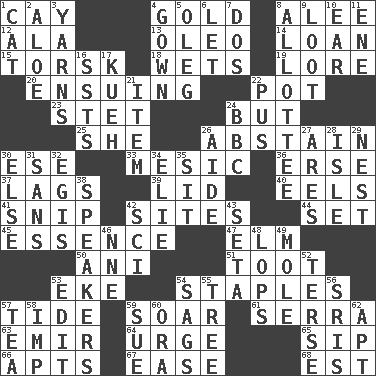 ACROSS 1. Island 4. Aureate 8. Toward shelter 12. Wing 13. Butter sub 14. Grant temporary use of 15. Cod relative 18. Soaks 19. Old wives' tales, e.g. 20. Taking place subsequently 22. Cooking vessel 23. Proofreading order 24. Yet 25. A female animal or person 26. Refrain by choice 30. Compass dir. 33. Of or pertaining to a meson 36. Celtic language 37. Fails to keep up a pace 39. Flaplike covering 40. Snakelike fish 41. Clip 42. Locates 44. Arrange properly for use 45. Center 47. Shade tree 50. Cuckoo 51. A blast of a horn 53. Supplement with great effort 54. Paper fasteners 57. Periodic rise and fall of the sea level 59. Fly high 61. Father Junipero _ 63. Independent ruler or chieftain 64. Goad 65. Small drink 66. Tenement units (abbr.) 67. Comfort 68. Eastern Standard Time (abbr.) DOWN 1. Domesticated feline 2. _ vera 3. Tall tales 4. Long dress 5. Cassini of fashion 6. Allow 7. Two (Sp.) 8. One to whom something is allotted 9. Plunder 10. Hearing organ 11. Compass dir. 16. Fast planes 17. Malaysian steamed pastry 21. Detail 22. Fluid product of inflammation 24. English channel? 26. Helper 27. Ancient Greek god of war 28. Small island 29. A home for chicks 30. Otherwise 31. Without 32. The front part of a cuirass 34. Writer Wiesel 35. Be seated 38. Orators 42. _-fi 43. Stalk of a moss capsule 46. Compass dir. 48. Chops off 49. Undercover agent 52. Laconic 53. Prepare for publication 54. Settles 55. Relationship diagram 56. Indian titles of respect 57. Beverage made from leaves 58. Mischievous child 59. Take to court 60. Mouth or opening 62. Fitting