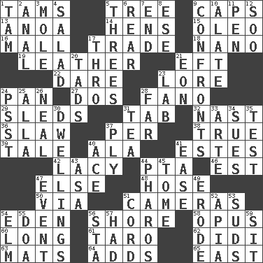 ACROSS 1. Scottish caps 5. Relationship diagram 9. Smile enhancers 13. Small Philippine buffalo 14. Coop moms 15. Margarine 16. Promenade 17. Swap 18. Billionth: prefix 19. Cordwainer's material 21. Bank Draft (abbr.) 22. Have the gumption 23. Old wives' tales, e.g. 24. Baking dish 27. Two (Sp.) 28. Papal veil 29. Bobsleighs 31. Keyboard key 32. Political cartoonist Thomas 36. Cole _ (cabbage dish) 37. For each 38. Loyal 39. Story 40. Chicken ___ king 41. _____ Park, CO 42. Made of lace 44. Parent Teacher Association (abbr.) 46. Eastern Standard Time (abbr.) 47. Otherwise 48. Stockings 50. By way of 51. Devices for capturing images 54. Genesis locale 56. Dinah or Pauly 58. Musical composition 60. Having great length 61. Edible starchy tuberous root 62. "You Light Up My Life" star Conn 63. Floor protectors 64. Does sums 65. Compass direction DOWN 1. Scottish cap 2. Of or related to the anus 3. Undercover agent 4. First course 5. Triads 6. Located in or toward the back 7. Conclusion 8. Compass dir. 9. Meets 10. Having winglike extensions 11. Writing instrument 12. "Barney Miller" actor Jack 17. Through, poetically 20. Small boys 21. Period of immesurable duration 23. Experiment locale 24. Inconspicuous attention getter 25. Silent film actress Nazimova 26. Be tempered by heat 28. At a great distance 30. Residences 31. Beverage made from leaves 33. Johnson of "Laugh-In" 34. Takes to court 35. Trial 37. Travel a route regularly 40. Adept person 41. Comfort 43. White ___ sheet 44. N Egypt peninsula 45. Heavy book 47. Happening 49. Eat (away) 51. Drawstring 52. Capital of Western Samoa 53. Beer foam 54. Shade tree 55. ___ good deed 56. R.R. building 57. Possessed 59. Be seated