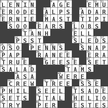 ACROSS 1. Soviet premier 1918-24 6. Ripen 9. Australian flightless bird 12. Wear away 13. High mountains 14. The sixth month of the Jewish calendar 15. Bert's buddy 16. Vertical spar for supporting sails 17. Native american tent (variation) 18. "Barney Miller" actor Jack 19. Hearing organs 20. Tennis shots 21. Hyperbolic tangent 23. Pipe bend 24. Inconspicuous attention getter 25. Bobsleighs 28. Bear (Spanish) 30. Actor Sean's family 34. Fastener 35. Infant food 36. The wife of a rajah (variant) 38. Epoch 39. Loyal 41. Honkers 43. Put into a specified state 44. Vegetable dish 46. Scottish caps 48. White ___ sheet 49. We are 50. Group working together 51. Relationship diagram 53. Compass dir. 56. Silvers or Donahue 57. Sew up the eyelids of hawks and falcons 58. Sadhe (variant) 60. Puts into a specified state 61. Slanted text style (abbr.) 62. Sun: prefix 63. Attempt 64. For each 65. _____ Park, CO DOWN 1. Area sheltered from the wind 2. Blunders 3. Words to Nanette 4. Foolish or stupid persons 5. Born 6. Having or resembling wings 7. Global Positioning Systems (abbr.) 8. Eastern Standard Time (abbr.) 9. The property of being fit to eat 10. Atlas contents 11. RI univ. 13. Nursemaid 14. Ringlike coral islands and reefs 19. Keyboard key 20. French article 22. Cleo's killer 24. Teen's desire 26. Have the gumption 27. Argument over a trivial matter 28. Chooses 29. "Two Mules for Sister ____" 31. Tired old horse 32. Compass dir. 33. Perceive with the eye 37. First name in cosmetics 40. Artist's stands 42. Hearing organ 45. Obsolete 47. Makes clutter 49. Water source 50. "Mermaids" star 51. Wig 52. Bring up, as a child 54. Table seasoning 55. Singer Brickell 56. Pacific Standard Time (abbr.) 57. Small drink 58. Definite Article 59. Greek goddess of the dawn