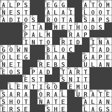 ACROSS 1. High mountains 5. Ovum 8. Tiny particle 12. Egg locale 13. Jai _ 15. Plunder 16. Goodbye (Sp.) 18. Round or rotation of duties 19. Plant excrements 20. Parent Teacher Association (abbr.) 22. Modes 24. Inside of hand 26. Reproach for some lapse or misdeed 27. To the inside or interior of 28. To free from 29. _ tizzy (2 wds.) 32. Woman's formal wear 35. Coalition 37. Small boy 38. Cassini of fashion 39. Sound made by sheep 40. Yawn 41. Remaining after all deductions 42. Confederate soldiers (slang) 43. ____ Bator 44. Greek goddess of the dawn 45. Writing tablet 46. Small pie 49. Eastern Standard Time (abbr.) 50. In a ____ (agitated or irritated) 51. Small, flat, pigmented spot on the skin 55. Australian flightless bird 56. "Two Mules for Sister ____" 57. Relating to the mouth 59. A salt of uric acid 63. Opportunity 64. Nathan's nickname 65. Actor Alda or Thicke 66. Celtic language 67. A female animal or person 68. Straggles DOWN 1. Santa ___, CA 2. Directed 3. 23rd letter of the Greek alphabet 4. Closing up, plugging up 5. Hearing organ 6. Take by theft 7. Yard entry 8. Columnist Joseph or Stewart 9. Frog relative 10. I made a mistake 11. Mountains (abbr.) 14. Of or pertaining to medicine 17. Comedian Laurel of Laurel & Hardy 21. The first octave above the treble staff 23. Possessed 25. Crowded into 28. Ridicules or criticizes harshly 29. Slanted text style (abbr.) 30. California wine valley 31. Arabian gulf 32. Went 33. Butter sub 34. Moistens 36. Experiment locale 40. From the throat 42. Food allowance for one day 45. Pacific Standard Time (abbr.) 47. A saturated hydrocarbon 48. Tall New Zealand timber tree 49. Maternal 51. Cowardly lion portrayer 52. Greek god of love 53. Pate de foie ____ 54. Pledge 56. Compass dir. 58. Area sheltered from the wind 60. Wing 61. Label 62. Followers of ems