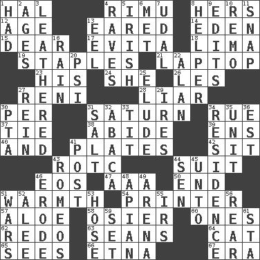 ACROSS 1. Actor Linden 4. Tall New Zealand timber tree 8. Possessive pronoun 12. Grow older 13. Having ears or earlike features 14. Paradise 15. Letter starter 17. Webber/Rice musical 18. Pale green bean 19. Paper fasteners 21. Portable computer 23. Part of HMS, perhaps 24. A female animal or person 26. French article 27. Painter Guido (1575-1642) 28. One who doesn't tell the truth 30. For each 31. Titan orbits this 34. Regret 37. Standoff 38. Remain 39. Followers of ems 40. Added to 41. Food holders 42. Be seated 43. College mil. group 44. Costume for a special activity 46. Greek goddess of the dawn 47. Auto club (abbr.) 50. Conclude 51. Heat 54. Hard copy producer 57. Medicinal plant 58. Flexible twig of a willow tree 60. Singles 62. Make new 63. Actors Connery and Penn 64. Feline 65. Perceives with the eye 66. Inactive volcano in Sicily 67. Epoch DOWN 1. Possessed 2. Grows older 3. Tough but pliablecoriaceous 4. All-night dance parties 5. From or relating to Ireland 6. Was introduced to 7. Hereditary estate 8. Aide 9. Prepares for publication 10. San ____ (Riviera town) 11. Fastener 13. Snakelike fish 16. Precipitation 20. 23rd letter of the Greek alphabet 22. Actor Alda or Thicke 25. Evade 27. It's straight from the horse's mouth 29. Angers 30. Parent Teacher Assoc. 31. Table seasoning 32. Phillipine bananalike plant 33. Teat (slang) 34. Dwelling 35. A single undivided whole 36. Eastern Standard Time (abbr.) 41. Mail 43. Lover boys 44. Elected rep. 45. To (old English) 46. Wear away 48. Bee-related 49. Sports stadium 51. Armed conflicts 52. Toward shelter 53. Stockings 55. Big collection agency 56. Tail end 59. Arrange properly for use 61. R.R. building