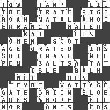 ACROSS 1. Pull behind 4. Pack (down) 8. Cards in a Roman deck? 11. Binary compound 12. Feeling or showing extreme anger 14. Swiss mountan, "Queen of the Mountains" 15. Wander aimlessly 17. Brizilian seaport 18. Mine, in Marseilles 19. The state or an instance of erring 21. Mother 23. Krazy ___ of comics 24. French article 25. Presage 27. Native of Scotland 30. Personal question 31. Declaimed 34. Big collection agency 37. Indian title of respect (Mr.) 38. Silly 39. Born 40. Fenced enclosure 41. Greek mezzo-soprano Agnes 43. Make lace 44. Small island 45. Lip ointment 47. Was introduced to 49. Lair 50. Miss Universe 1986, Barbara Palacios _ 52. Electrical Measurement 56. Yard entry 57. Constellation of myth 60. A type of plum 61. Ancient Greek god of war 62. Dinah or Pauly 63. Pipe bend 64. And not 65. Singles 66. Begley and Asner DOWN 1. Hoop that covers a wheel 2. Scent 3. Put on (as clothing) 4. A color or tint 5. Like ___ of sunshine 6. Floor covering 7. Parent Teacher Association (abbr.) 8. Citrus fruits 9. Russian composer Stravinsky 10. One more than two 13. Shade tree 14. Pace 16. Create 20. Billionth: prefix 22. Keyboard modifier key 25. Legendary monster 26. Count _ (2 wds.) 27. Having lost freshness 28. Penny 29. Lyric poems 30. Cleo's killer 32. Teases 33. Of or related to the anus 34. International (abbr.) 35. 480, 500 or 516 sheets of paper 36. Put into a specified state 42. Collude with 44. It would 46. Pismires 47. Distance measurement 48. Sight organs 49. Natives or inhabitants of Denmark 50. Pacific island yam 51. Greek goddess of the dawn 52. Had on 53. Toward shelter 54. Aureate 55. Snakelike fish 56. Separate the seeds from cotton 58. 17th letter of the Greek alphabet 59. Electrically charged atom