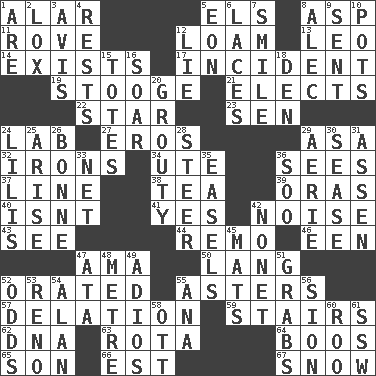 ACROSS 1. Having or resembling wings 5. Raised railways 8. Viper 11. Be footloose 12. Rich soil 13. Lion 14. Is extant 17. Event 19. Moe Howard, for one 21. Opts 22. Play the lead 23. Elected rep. 24. Experiment locale 27. Greek god of love 29. White ___ sheet 32. Removes the wrinkles 34. Shoshoni 36. Observes 37. Actor's bit 38. Beverage made from leaves 39. Mouths or openings 40. Is not 41. It is so 42. Annoying sound 43. Perceive with the eye 44. San ____ (Riviera town) 46. Car or cant ending 47. Nursemaid (var.) 50. Long (Scottish) 52. Spoke pompously 55. Michaelmas daisies 57. Accusation by an informer 59. Flight of steps 62. Heredity factor (abbr.) 63. Roll call or roster of names 64. Scornful sounds 65. Boy, to dad 66. Eastern Standard Time (abbr.) 67. Frozen precipitation DOWN 1. "We ___ not amused" (Victoria) 2. Brine-cured salmon 3. Advice 4. Musical pauses 5. Period of immesurable duration 6. Shoestrings 7. Grin 8. Actor Baldwin 9. Posted 10. Cooking vessels 12. Whopper 15. Lugs 16. Fly high 18. Lair 20. Sulky 24. Ms. Damita and namesakes 25. Get up 26. Child's nurse 28. Bull 29. Nest on high 30. Gospel singer Marvin 31. NE Netherlands city 33. Remaining after all deductions 35. Artist's stands 36. "Barney Miller" actor Jack 42. Music written for nine 45. Floor coverings 47. "One Day ___ Time" 48. Distance measurement (Brit.) 49. Goodbye (Sp.) 51. Takes hold of 52. Probability 53. Western Nevada city 54. Actor Alda or Thicke 55. Santa ___, CA 56. The Jewish people; Israel 58. Baseball player Mel 60. Friend of Pooh 61. Compass dir.