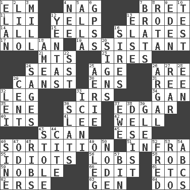 ACROSS 1. Shade tree 4. Tired old horse 7. Cy Young winner Saberhagen 11. Cards in a Roman deck? 12. Sharp bark 13. Wear away 14. 100% 15. Snakelike fish 16. Chalkboards 17. Pitcher Ryan 19. Aide 21. Mountains (abbr.) 23. Angers 24. Oceans 25. Personal question 26. "We ___ not amused" (Victoria) 29. 2nd pers. sing. pres. of can (arch.) 30. Followers of ems 31. To riddle 32. Part of a journey 33. Big collection agency 34. Separate the seeds from cotton 35. Compass dir. 36. _-fi 37. _ Allan Poe 40. It is 41. Area sheltered from the wind 42. Not ill 43. Glance over 45. Compass dir. 46. Determination 51. Kind of red light 55. Foolish or stupid persons 56. Tennis shots 58. Director Reiner 59. Impressive in appearance 60. Prepare for publication 61. And so on (abbr.) 62. Celtic language 63. Commissioned military rank (abbr.) 64. Two (Sp.) DOWN 1. Enthusiasm 2. _ and Stitch 3. Place where flour is made 4. Born 5. Silent film actress Nazimova 6. Global Positioning Systems (abbr.) 7. Naughty children 8. Round or rotation of duties 9. Locale of original sin 10. Trial 12. Gossips 13. Otherwise 16. Fathers 18. So be it 20. Public displays of written messages 22. Fast jet (abbr.) 24. Gurus 25. Nest on high 26. Therefore, facetiously 27. Located in or toward the back 28. Car or cant ending 29. Penny 32. Luau accessory 33. Ancient Celtic tribe of eastern Britain 36. Narrow boards 37. She-sheep 38. Cease 39. Small, secluded valley 43. Fur scarf 44. Quote 46. Trig term 47. Aroma 48. Teases 49. Cassini of fashion 50. Thickened enlargement 52. Flintstone 53. Printing process, for short 54. Lettered men learn these first 57. Storage container