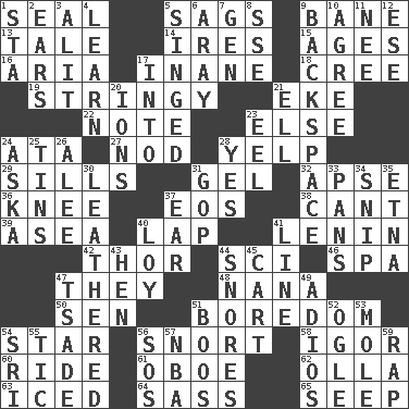 ACROSS 1. Lick closed 5. Droops 9. Object of repulsion 13. Lie 14. Angers 15. Grows older 16. Roberta Peters solo 17. Silly 18. Algonquian 19. Slender, wiry 21. Supplement with great effort 22. Musical sound 23. Otherwise 24. _ moment's notice (2 wds.) 27. Dreamland 28. Sharp bark 29. Beverly of Met fame 31. Set 32. Domed church section 36. Leg joint 37. Greek goddess of the dawn 38. Patter 39. Toward the sea 40. Pet locale 41. Soviet premier 1918-24 42. Son of Odin 44. _-fi 46. Health resort 47. Those people 48. Nanny 50. Elected rep. 51. Mood resulting from idleness 54. Play the lead 56. Derisive sound 58. Composer Stravinsky 60. Travel on or in a vehicle 61. Mitch Miller's instrument 62. Water jar 63. On the rocks 64. Backtalk 65. Ooze DOWN 1. R.R. building 2. Hearing organs 3. Came down and settled, as after flight 4. Acquire or gain knowledge or skills 5. Burned superficially 6. Like ___ of sunshine 7. Commissioned military rank (abbr.) 8. Compass dir. 9. Keyboard key 10. Match 11. Born 12. Compass dir. 17. To the inside or interior of 20. Charged atoms 21. Pipe bend 23. Snakelike fish 24. "____ silly question..." 25. Metal containers 26. Toward shelter 28. It is so 30. Tough but pliablecoriaceous 31. Grand Old Party 33. Baking dishes 34. Clip 35. Inactive volcano in Sicily 37. Hearing organ 40. Myrna of the movies 41. Actor's bit 43. Layer 44. Sounds asleep 45. Haul 47. Sadhe (variant) 49. Goodbye (Sp.) 51. Scornful sounds 52. Stare 53. Undercover agent 54. Indian title of respect (Mr.) 55. Nervous spasm 56. Mayday 57. Basketball assoc. 59. Strike