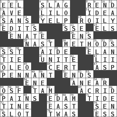 ACROSS 1. Snakelike fish 4. Volcanic refuse 8. Tear apart 12. "___ Maria" 13. _ and Stitch 14. The main thing one is thinking about 15. Without 17. Sharp bark 18. Agitated, as a liquid 19. Prepares for publication 21. Compass dir. 23. Raised railways 24. Related on the mother's side 26. Followers of ems 28. Political cartoonist Thomas 30. Modes 34. Fast jet (abbr.) 37. Assistant 39. Enthusiasm 40. Neckwear 41. Join together 43. Cards in a Roman deck? 44. Butter sub 46. Certainty 47. Viper 48. Pre-World Series prize 51. Conclusions 54. Compass dir. 55. Approach 58. Order of Saint Francis (abbr.) 61. Scottish cap 63. Sour-tasting 65. Aches 67. Dutch treat 71. Event that recurs at intervals 72. Prong on a fork 73. Compass direction 74. Elected rep. 75. Groove 76. It was, poetically 77. Double-curved letter DOWN 1. Relaxation 2. Dodge 3. Soviet premier 1918-24 4. Insidious 5. Whopper 6. Everything 7. Republicans 8. River (Sp.) 9. Singer Brickell 10. 1994 drama film starring Jodie Foster 11. 24-hour periods 16. Comedian Laurel of Laurel & Hardy 18. Monthly bill 20. R.R. building 22. Perceive with the eye 25. He sold his birthright 27. A female animal or person 29. A color or tint 30. Distance measurement (Brit.) 31. Rounded earthenware pot or jar 32. Raised platform 33. Clip 34. Discontinue 35. Filth; sediment 36. Adolescent 38. Pass on 42. Inactive volcano in Sicily 45. Single 49. Pismires 50. Teachers' org. 52. Heredity factor (abbr.) 53. Religious group 56. Ascend 57. Amusement-park features 58. Chooses 59. Travel by water 60. Fine (Spanish) 62. Confront 64. Hiding places for outlaws 66. Remaining after all deductions 68. Fool 69. White ___ sheet 70. Mountains (abbr.)