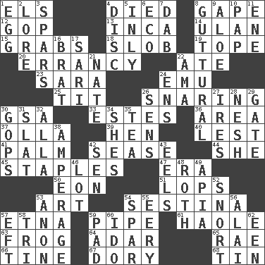 ACROSS 1. Raised railways 4. Passed on 8. Yawn 12. Grand Old Party 13. South American Indian 14. ____ Bator 15. Catches 18. Oscar Madison type 19. Drink excessively 20. Tendancy to err 22. Had dinner 23. "Two Mules for Sister ____" 24. Australian flightless bird 25. Teat (slang) 26. Catching in a trap 30. Girls' org. (abbr.) 33. _____ Park, CO 36. Length times width 37. Water jar 39. Layer 40. For fear that 41. Inside of hand 42. Gospel singer Marvin 44. A female animal or person 45. Paper fasteners 47. Epoch 50. Period of immesurable duration 51. Chops off 53. Tate display 54. French poetic form 57. Inactive volcano in Sicily 59. Corncob 61. White Person, in Hawaii 63. Toadlike animal 64. The sixth month of the Jewish calendar 65. Actress Charlotte 66. Prong on a fork 67. Small, narrow, flatbottom fishing boat 68. Metal container DOWN 1. Ovum 2. Old wives' tales, e.g. 3. Practice fights 4. Flat circle 5. In an inward manner 6. Environmental prefix 7. Small moist lump or mass 8. From the throat 9. Medicinal plant 10. Infant food 11. Compass dir. 16. Naughty child 17. Indian skirt 21. Nathan's nickname 22. Nanny (var.) 24. Followers of ems 26. Elected reps. 27. Angers 28. Soft 29. Yard entry 30. Republicans 31. Narrow board 32. Silent film actress Nazimova 34. "______ My Girl" (Turtles hit) 35. Beverage made from leaves 38. Electrical Measurement 42. Elected rep. 43. Snakelike fish 46. Car dealer's back yard 48. Writer of Portnoy's Complaint (1969) 49. Capital of Western Samoa 52. Derisive sound 53. At once, immediately (arch.) 54. Coast Guard woman 55. Suggestive of the supernatural 56. Jai _ 57. Bank Draft (abbr.) 58. Three (prefix) 59. Groovy apt. 60. Wedding promise 62. Car or cant ending