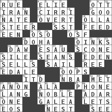 ACROSS 1. Regret 4. Writer Wiesel 8. Baseball player Mel 11. SW Asia republic 13. High-altitude cloud 15. Thick or sticky substance 16. Nathan's nickname 17. Unconcealed 18. Water jar 19. Navigate 21. Fast jet (abbr.) 22. Nourish 23. Car or cant ending 24. Bear (Spanish) 27. Order of Saint Francis (abbr.) 29. Capital of the state of Qatar 30. Pig sounds 34. Fool 36. He sold his birthright 39. Biscuitlike quick bread 40. Drop; flow; fall 41. Seines 43. Paradise 44. Makes a sale 46. Travel by water 47. To riddle 48. Peak District village in England 49. I made a mistake 51. It would 53. Basketball assoc. 54. Was introduced to 57. At once, immediately (arch.) 60. Wing 63. Give a jingle 65. Austrian-born American filmmaker Fritz 66. Having high moral qualities 69. The sixth month of the Jewish calendar 70. Single 71. An organ shaped like a helmet 72. Allows 73. Greek goddess of the dawn 74. A home for chicks 75. Perceive with the eye DOWN 1. Wash lightly 2. A salt of uric acid 3. Consumed 4. Environmental prefix 5. 54 in ancient Rome 6. Angers 7. Blunders 8. Stare at amorously 9. Lacquered or enameled metalware 10. Frog relative 12. Born 14. "Tell ____ the Marines!" 18. Persons of authority 20. Friend of Pooh 25. "______ My Girl" (Turtles hit) 26. Fertile tracts in a desert 28. Distress signal 29. Home 31. Thickened enlargement 32. Leg joint 33. Elected rep. 34. Passed on 35. Silent film actress Nazimova 37. American Automobile Association (abbr.) 38. The state of being joined or united 40. Compass dir. 42. Oscar Madison type 45. Put into a specified state 50. Infant food 52. Mild oath, euphamism for damn 54. Methods 55. Maternal 56. Laconic 57. _ vera 58. Billionth: prefix 59. Singles 61. Grant temporary use of 62. Competent 64. Actor Linden 67. French article 68. Ingest