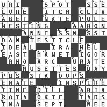 ACROSS 1. RI univ. 4. Specific locale 8. Compass dir. 11. Old wives' tales, e.g. 13. Hankering 14. 154 in Roman numerals 15. Collude with 16. Nathan's nickname 17. Whimper 18. Snuggling 21. Composer Copland 22. Queen of England 1702-14 23. Compass dir. 25. Fast jet (abbr.) 26. Daniel's nick name 29. One of the two male reproductive glands 32. Standard of perfection 34. Retirement account (abbr.) 35. Cartoonist voice _ Blanc 38. 90 degrees 39. French painter Edouard 41. Composer Stravinsky 43. 17th letter of the Greek alphabet 44. Curve 45. A salt of uric acid 46. French bagpipes 50. 24 hours 51. Fluid product of inflammation 54. R.R. building 55. I made a mistake 57. Maternal 59. Heighten or intensify 63. Prong on a fork 64. Deli pickle 67. Roberta Peters solo 68. Roll call or roster of names 69. Migrant worker of the '30s 70. Small boys 71. _ tizzy (2 wds.) 72. Back-to-school mo. 73. Born DOWN 1. Uhlan (variant) 2. Loose flowing garment 3. Angers 4. Scorches 5. Parent Teacher Association (abbr.) 6. Sep. follower 7. Definite Article 8. Runs notes together 9. Grain storage towers 10. Happening 12. Singer James 14. Numbers guy (abbr.) 19. International (abbr.) 20. Compass dir. 21. Leather borer 23. Beget 24. Leave at once 26. Pass on 27. The sixth month of the Jewish calendar 28. Soft 30. Tinged 31. Arab leader 33. Tiny particle 36. Mild oath 37. Globular water bottle used in Asia 39. Vertical spar for supporting sails 40. Type of rug 42. Marina Del _, California 45. United States Postal Service (abbr.) 47. Purpose 48. Rest room 49. Period of immesurable duration 51. _ dish (used to culture cells) 52. The state of being joined or united 53. Before Barbara or Clara 56. Argument over a trivial matter 58. Afternoon social gathering 60. SW Asia republic 61. Travel on or in a vehicle 62. Relaxation 64. Two (Sp.) 65. Eisenhower's nickname 66. Mouth edge