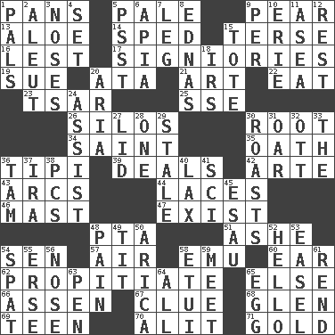 ACROSS 1. Zero-star reviews 5. Diluted with white 9. Lightbulb-shaped fruit 13. Medicinal plant 14. Broke a traffic law 15. Laconic 16. For fear that 17. Seigniories (variant) 19. Institute legal proceedings 20. _ moment's notice (2 wds.) 21. Nonscientific branch of learning 22. Ingest 23. Russian ruler of old 25. Compass dir. 26. Grain storage towers 30. Carrot, for example 34. Virtuous person 35. Pledge 36. Native american tent (variation) 39. Allots cards 42. Johnson of "Laugh-In" 43. Curves 44. Shoestrings 46. Vertical spar for supporting sails 47. Be extant 48. Parent Teacher Association (abbr.) 51. American tennis player Robert 54. Elected rep. 57. Atmosphere 58. Australian flightless bird 60. Hearing organ 62. Appease 65. Otherwise 66. NE Netherlands city 67. A slight indication 68. Small, secluded valley 69. Adolescent 70. Set down 71. Aureate DOWN 1. Friends 2. Eskimo relative 3. Olfactory organs 4. Put into a specified state 5. Inconspicuous attention getter 6. Capital of Western Samoa 7. Part of a journey 8. Ferber et al. 9. For each 10. 4th largest of the Great Lakes 11. Toward the sea 12. Take ten 15. Haul 18. Big collection agency 20. Operatic vocal solo 24. Help 27. Hat (slang) 28. Single 29. Having lost freshness 30. Ridicules or criticizes harshly 31. Rowing implement 32. Baseball player Mel 33. Definite Article 36. Scottish cap 37. Retirement account (abbr.) 38. Personal Computers (abbr.) 40. Not strict 41. _-fi 45. Son of Isaac 48. Ache 49. Teat (slang) 50. N. Chile seaport 52. Phone greeting 53. Artist's stand 54. Argument over a trivial matter 55. Celtic language 56. Characteristic smell of wine 58. Needle case 59. Confront 61. Tear apart 63. Writing instrument 64. Everything 65. Oval reproductive body of a fowl