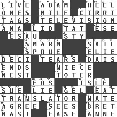 ACROSS 1. Moving, as bait 5. First of billions? 9. The bottom of a shoe or boot 13. Singles 14. The longest river in the world 15. High-altitude cloud 16. Labels 17. Boob tube 19. Santa ___, CA 20. Hat (slang) 21. Make lace 22. Compass dir. 23. Son of Isaac 25. Filthy place 26. Excessive but superficial compliments 30. Travel by water 34. Upset 35. Writer Wiesel 36. Tenth: prefix 39. Rends 42. Raised platform 43. Extremities 44. Sibling's daughter 46. Egg locale 47. Carrier 48. Greek goddess of the dawn 51. Capri or Wight 54. Take to court 57. Whopper 58. Set 60. Ingest 62. Interpreter 65. Nathan's nickname 66. Match 67. Perceives with the eye 68. Cy Young winner Saberhagen 69. Political cartoonist Thomas 70. Relaxation 71. Singer Murray DOWN 1. Globular water bottle used in Asia 2. Lacking in sense or substance 3. Viva Las _ 4. Double-curved letter 5. Against 6. Passed on 7. 100% 8. Confronts 9. Part of HMS, perhaps 10. One of the Great Lakes 11. Greek god of love 12. Actor's bit 15. Municipality 18. Large container 20. Mass 24. Aid 27. Nonscientific branch of learning 28. Regret 29. Intended 30. Spring feasts 31. Insect wing 32. One more than two 33. French article 36. Lair 37. Compass dir. 38. Music discs 40. River (Sp.) 41. Arrange properly for use 45. To provide with a ceiling 48. Otherwise 49. Petroleum 50. Gospel singer Marvin 52. Memorize 53. Eroded 54. Comedian Laurel of Laurel & Hardy 55. Capital and largest city of Mongolia 56. Hearing organs 58. Moves 59. Celtic language 61. False hair 63. Fish or hair follower 64. Beverage made from leaves 65. Basketball assoc.