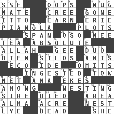 ACROSS 1. Compass dir. 4. I made a mistake 8. Large cup 11. Nathan's nickname 13. Algonquian 14. Went 15. "Tell ____ the Marines!" 16. Merit 17. One of the Great Lakes 18. Player piano 21. Ground plans 22. Connect, as a bridge 23. Bear (Spanish) 25. Born 26. Afternoon social gathering 29. Utter; complete 32. Assad's deity 34. Turn to the right 35. Superhero pair 38. South Vietnam president (1954) 39. Grain storage towers 41. Pismires 43. Environmental prefix 44. Binary compound 45. Leaves out 46. Consumed 50. Pull behind 51. Fish or hair follower 54. Santa ___, CA 55. Supplements with great effort 57. Amid 59. Inhabiting a nest 63. Male parent of an animal 64. Passed on 67. Type of rug 68. _ mater 69. 43,560 square feet 70. A home for chicks 71. Sodium hydroxide 72. Necklace unit 73. A female animal or person DOWN 1. Sever or remove by pinching or nipping 2. Suttee (variant) 3. Singer James 4. Seas 5. Mouth or opening 6. For each 7. Elected rep. 8. Person of subnormal intelligence 9. Join together 10. Honkers 12. Immeasurably long periods of time 14. Set 19. Brightly colored fish 20. Experiment locale 21. Cooking vessel 23. Margarine 24. Takes to court 26. Bit 27. Writer Wiesel 28. Actor Baldwin 30. Stares 31. Dutch treat 33. Mine, in Marseilles 36. A single undivided whole 37. Von Bismarck 39. Attach a signature 40. The content of cognition 42. Compass dir. 45. Lyric poems 47. Tired old horse 48. Looked after 49. Make supply last 51. Rhinal 52. Poet Dickinson 53. Singer Mel 56. Comedian Laurel of Laurel & Hardy 58. Teachers' org. 60. Angers 61. Delicate 62. Yard entry 64. Pat or tap gently 65. Frozen water 66. Epoch