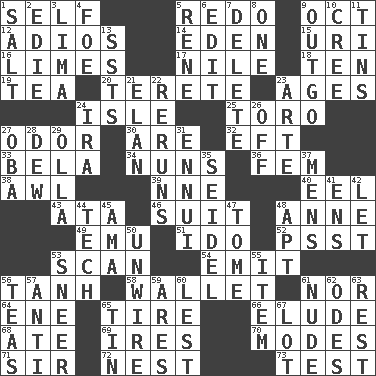 ACROSS 1. Itself 5. Make new 9. Sep. follower 12. Goodbye (Sp.) 14. Paradise 15. RI univ. 16. Citrus fruits 17. Mediterranean tributary 18. "___ Little Indians" 19. Beverage made from leaves 20. Cigar-shaped 23. Grows older 24. Small island 25. "Corrida" creature 27. Scent 30. "We ___ not amused" (Victoria) 32. Lizard (obsolete) 33. Actor Lugosi 34. Religious women 36. Opposite of masc. 38. Leather borer 39. Compass dir. 40. Snakelike fish 43. _ moment's notice (2 wds.) 46. Set of matching outer garments 48. Singer Murray 49. Australian flightless bird 51. Wedding promise 52. Inconspicuous attention getter 53. Skim 54. Give off 56. Hyperbolic tangent 58. Place for singles 61. And not 64. Compass dir. 65. Hoop that covers a wheel 66. Dodge 68. Had dinner 69. Angers 70. Methods 71. Title for a knight 72. Egg locale 73. Trial DOWN 1. Table seasoning 2. Singer Brickell 3. Pale green bean 4. Enemy 5. French philosopher Descartes 6. Prepare for publication 7. Erase 8. Single 9. Money paid out 10. Algonquian 11. Metal containers 13. Fast planes 21. Liveliness 22. Summer TV shows 23. Johnson of "Laugh-In" 24. Lyricist Gershwin 26. No longer planned or scheduled 27. Chief or king in Benin or Nigeria 28. Morning condensation 29. Rounded earthenware pot or jar 31. World-weariness 35. Beer mug 37. Not women's 41. Followers of ems 42. Allow 44. Technical work 45. Nanny (var.) 47. Heavy book 48. Fitting 50. Undo the wiring of 53. Scornful expression 55. A distinct part 56. Beverages made from leaves 57. Against 59. Ancient Greek god of war 60. For fear that 61. Naked 62. Lyric poems 63. Take ten 65. Shallow baking pan 67. Car dealer's back yard
