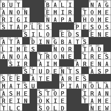 ACROSS 1. On the contrary 4. Indonesian resort city 8. Tired old horse 11. At once, immediately (arch.) 13. Independent ruler or chieftain 14. Heavy book 15. Swiss mountan, "Queen of the Mountains" 16. California wine valley 17. Residence 18. Paper fasteners 21. Mexican monetary units 22. Grain storage tower 23. Begley and Asner 25. Compass dir. 26. _ moment's notice (2 wds.) 29. Empty-headed or silly people 32. Citrus fruits 34. And not 35. Small amount or degree 38. Small Philippine buffalo 39. Marketplace scale 41. Angers 43. Title for a knight 44. Direct toward a target or goal 45. Sports stadium 46. SAT takers 50. Viper 51. Observe 54. Had dinner 55. Ancient Greek god of war 57. Taiwanese island in East China Sea 59. Player piano 63. American tennis player Robert 64. Close up, plug up 67. SW Asia republic 68. It's straight from the horse's mouth 69. Migrant worker of the '30s 70. Docile 71. Affectionate concern, for short 72. Disposed of to a purchaser 73. ___ Haven, CT DOWN 1. Soap units 2. A single undivided whole 3. Ancient Roman robe 4. Gillaume's butler role 5. Wet nurse (var.) 6. Mouth edge 7. Retirement account (abbr.) 8. Trap for birds or small mammals 9. ID or VA city 10. Honkers 12. Cuts off 14. Definite Article 19. Flaplike coverings 20. Biblical high priest 21. Pacific Standard Time (abbr.) 23. Inky black, to poets 24. Have the gumption 26. Insect wing 27. Canisters 28. Mine, in Marseilles 30. Dwarf 31. Use a spoon 33. Hearing organs 36. Type of rug 37. Cub Scout units 39. Pulled tight 40. Travel on or in a vehicle 42. Plant excrement 45. At sea 47. The 19th letter of the Greek alphabet 48. Slept 49. Three (prefix) 51. Don Adams' spy role 52. Artist's stand 53. Moral principle 56. In a ____ (agitated or irritated) 58. Elected rep. 60. Northwest Algerian city 61. Unable to walk 62. Afresh 64. Distress signal 65. Ring climax 66. Petroleum