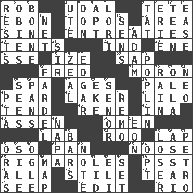 ACROSS 1. Director Reiner 4. Allodial 8. Wig 12. Inky black, to poets 14. Traditional theme or motif 16. Length times width 17. Trig term 18. Pleas 20. Portable shelters 22. Working for oneself (abbr.) 23. Compass dir. 24. Compass dir. 25. Ending with capital 28. Plant excrement 30. Flintstone 31. Person of subnormal intelligence 35. Health resort 37. Eons 40. Diluted with white 41. Lightbulb-shaped fruit 42. Member of a famous L.A. basketball team 44. _ and Stitch 45. Be inclined (to) 46. French philosopher Descartes 47. _ tizzy (2 wds.) 48. NE Netherlands city 50. Presage 52. Experiment locale 54. Friend of Pooh 55. Infant locale 58. Bear (Spanish) 61. Baking dish 63. Trap for birds or small mammals 65. Frustrating wastes of time 70. Inconspicuous attention getter 71. Silent film actress Nazimova 72. Vertical member of a panel or frame 73. Separate forcefully 74. Ooze 75. Prepare for publication 76. _ de Janeiro DOWN 1. Musical pauses 2. Off-Broadway awards 3. Child's nurse 4. Shoshoni 5. Spanish title 6. Fitting 7. Australian parrot (variant) 8. Make lace 9. 4th largest of the Great Lakes 10. Adolescent 11. Relaxation 13. Fish or hair follower 15. Elected reps. 19. First of billions? 21. Title for a knight 26. Ardor 27. _ Allan Poe 29. Cotton for raincoats, e.g. 30. Pack 32. Water falling in drops from the sky 33. Spanish pot 34. Modern: prefix 35. Observes 36. Zero-star reviews 38. Supplement with great effort 39. Sir (Sp.) 41. Parent Teacher Assoc. 43. San ____ (Riviera town) 49. California wine valley 51. A really long time 53. Long, evenly shaped pieces 55. Failure 56. Slender Brazilian palm 57. Stone: prefix 58. Mouths or openings 59. Drop; flow; fall 60. Stare at amorously 62. Observe 64. Elect 66. Atlas unit 67. Hat (slang) 68. Connecticut Ivy Leaguer 69. Put into a specified state