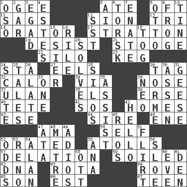 ACROSS 1. Double curve, resembling the letter S 5. Had dinner 8. Often (poetically) 11. Droops 12. The Jewish people; Israel 13. Three (prefix) 14. Speaker 17. Ski resort town in Vermont 19. Stop 21. Moe Howard, for one 22. Grain storage tower 23. Cask 24. R.R. building 27. Snakelike fish 29. Label 32. Bodily heat indicating an inflammation 34. By way of 36. Sense of smell 37. Uhlan (variant) 38. Raised railways 39. Celtic language 40. False hair 41. Distress signal 42. Dwellings 43. Compass dir. 44. Male parent of an animal 46. Compass dir. 47. Nursemaid (var.) 50. Oneself 52. Declaimed 55. Ringlike coral islands and reefs 57. Conveyance 59. Dirtied 62. Heredity factor (abbr.) 63. Round or rotation of duties 64. Be footloose 65. Male child 66. Eastern Standard Time (abbr.) 67. Adolescent DOWN 1. Bear (Spanish) 2. Slender fish 3. Mild oath 4. _____ Park, CO 5. Small island 6. Cod relative 7. Related on the mother's side 8. Von Bismarck 9. Tree-dwelling hopper 10. Prong on a fork 12. Fast jet (abbr.) 15. Flexible twig of a willow tree 16. Cause heat under the collar 18. Coat; cloak 20. Finds the solution 24. Snake scale 25. Stories 26. Having winglike extensions 28. Grain storage towers 29. Singer Mel 30. NE Netherlands city 31. Honkers 33. Single 35. Aid 36. Modern: prefix 42. Phone greeting 45. Vintage cars 47. "One Day ___ Time" 48. Distance measurement (Brit.) 49. Goodbye (Sp.) 51. Talk or behave amorously 52. Probability 53. Western Nevada city 54. Actor Alda or Thicke 55. Santa ___, CA 56. _ gin 58. Baseball player Mel 60. First lady 61. Lair