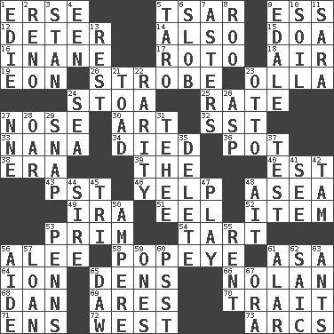 ACROSS 1. Celtic language 5. Russian ruler of old 9. Double-curved letter 12. Prevent from occurring 14. In addition 15. ___ good deed 16. Empty; void 17. Printing process, for short 18. Wind 19. Period of immesurable duration 20. Disco prop 23. Water jar 24. Portico 25. Assign a rank or rating to 27. Characteristic smell of wine 30. Nonscientific branch of learning 32. Fast jet (abbr.) 33. Nanny 34. Passed on 36. Plant holder 38. Epoch 39. Definite Article 40. Eastern Standard Time (abbr.) 43. Pacific Standard Time (abbr.) 46. Sharp bark 48. At sea 49. Lyricist Gershwin 51. Snakelike fish 52. Detail 53. Demure 54. Small pie 56. Toward shelter 58. Wimpy's pal 61. White ___ sheet 64. Electrically charged atom 65. Lairs 66. Pitcher Ryan 68. One of the 12 tribes of Israel 69. Ancient Greek god of war 70. Distinguishing feature 71. Followers of ems 72. Compass direction 73. Arches DOWN 1. Singer Brickell 2. Former U.S. Attorney General Janet 3. Comedian Laurel of Laurel & Hardy 4. Car or cant ending 5. Edible starchy tuberous root 6. Messy guy 7. Michaelmas daisies 8. Friend of Pooh 9. Peak District village in England 10. Land 11. "Two Mules for Sister ____" 13. Take ten 21. Frog relative 22. Noteworthy scarcity 23. Von Bismarck 24. Ocean 26. Viper 27. Compass dir. 28. Boat paddle 29. Fastener 31. Giggle 35. Keyboard key 37. Trial 41. Perceive with the eye 42. Scottish cap 44. Beget 45. Three (prefix) 47. Shaw product 48. Small island 50. Electrical Unit 53. Actor Sean's family 55. Monthly bill 56. Assistant 57. Grant temporary use of 59. Singles 60. Inconspicuous attention getter 61. Having or resembling wings 62. Ketch in the Levant 63. Pismires 65. Fool 67. Mouth or opening