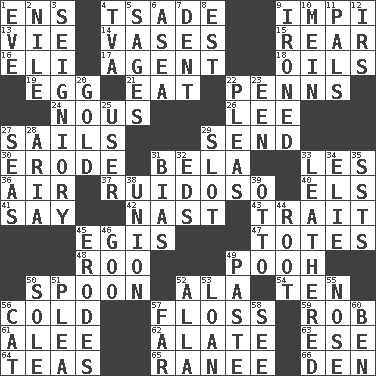 ACROSS 1. Followers of ems 4. Sadhe (variant) 9. Body of Kaffir warriors 13. Compete 14. Flower holders 15. Tail end 16. Biblical high priest 17. Representative 18. Petroleums 19. Oval reproductive body of a fowl 21. Ingest 22. Actor Sean's family 24. Horse sense 26. Area sheltered from the wind 27. Moves on water 29. Transmit 30. Eat (away) 31. Actor Lugosi 33. French article 36. Atmosphere 37. Noisy, rowdy, vocal (Spanish) 40. Raised railways 41. Declare 42. Political cartoonist Thomas 43. Distinguishing feature 45. The front part of a cuirass 47. Lugs 48. Friend of Pooh 49. "Silly old bear" 50. Soup utensil 52. Insect wing 54. "___ Little Indians" 56. Lacking warmth 57. Soft thread for cleaning between teeth 59. Director Reiner 61. Toward shelter 62. Having winglike extensions 63. Compass dir. 64. Beverages made from leaves 65. The wife of a rajah (variant) 66. Lair DOWN 1. Night before a holiday 2. "Death on the ____" 3. Signiory (variant) 4. Federal power corp. 5. Gurus 6. Toward the sea 7. Undesirable depression on a surface 8. Eastern Standard Time (abbr.) 9. Pressed 10. Count _ (2 wds.) 11. Friends 12. Big collection agency 20. Gilt 22. Entreaties 23. Car or cant ending 25. One who uses or employs something 27. Oceans 28. Roberta Peters solo 29. Notch 31. Prejudice 32. Begley and Asner 33. Resembling or made to resemble leather 34. Writer Wiesel 35. Fast planes 38. The state of being joined or united 39. "Beetle Bailey" pooch 44. Carrot, for example 45. Eats (away) 46. Thick or sticky substance 49. Thick mixture 50. Not divided or shared with others 51. Entreaty 52. Silent film actress Nazimova 53. Grant temporary use of 55. Sense of smell 56. Domesticated feline 57. At a great distance 58. Observe 60. Benjamin's nick name