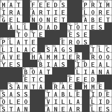 ACROSS 1. Floor protector 4. Eats 9. Demure 13. Lyricist Gershwin 14. Nick name for Arthur 15. Old wives' tales, e.g. 16. Set 17. Music written for nine 18. Collude with 19. Everything 21. Male parent 22. Lugs 24. Carry 26. Compass dir. 27. Food holder 29. Greek god of love 30. Pale purple color 31. Droops 33. Affectionate concern, for short 36. "___ Maria" 37. More overdramatic by comparison 40. Friend of Pooh 41. Affirmative reply 42. Prejudice 43. Perfect 45. Water vessel 47. Woody, climbing, usually tropical plant 48. And so on (abbr.) 49. Nourish 50. Before Barbara or Clara 52. Actress Charlotte 54. Madame (abbr.) 56. Backtalk 57. Eating place 59. Binary compound 61. Margarine 62. Country residence 63. Hat (slang) 64. Comedian Laurel of Laurel & Hardy 65. Approach 66. French article DOWN 1. Russian fighter aircraft 2. Length times width 3. Baron Munchausen's specialties 4. Avid follower 5. Wear away 6. Inactive volcano in Sicily 7. Passed on 8. Put into a specified state 9. Food holders 10. Loose flowing garment 11. Angers 12. Was introduced to 20. Globular water bottle used in Asia 22. Laconic 23. Bear (Spanish) 25. Georgia ____ (Atlanta school) 27. Live dramatic performance 28. Not recorded 29. Armor plate that protects the chest 31. Stricken, poetically 32. Nursemaid (var.) 33. Excercise machine 34. Grant temporary use of 35. Root beer relative 38. Phillipine bananalike plant 39. Cause heat under the collar 44. South Vietnam president (1954) 45. Gillaume's butler role 46. Baseball player Mel 49. Man or boy (slang) 50. Table seasoning 51. At sea 52. Water falling in drops from the sky 53. Competent 55. Singer Brickell 56. Mayday 57. Federal power corp. 58. Hearing organ 60. Begley and Asner