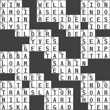 ACROSS 1. Victory 4. Water source 8. The Jewish people; Israel 12. Mine, in Marseilles 14. At sea 15. Inside; within (prefix) 16. Precipitation 17. Homes 20. System (abbr.) 21. Simpleton 22. Binary compound 23. A person who is older than you are 27. Necklace unit 29. Jacques Cousteau's middle name 31. Oceans 34. Honkers 35. Clip 36. Swedish rock group 39. Make lace 41. Singer James 42. Rich soil 43. Unit of acoustic absorption 46. Event scenes 47. Enthusiasm 48. Leg joint 51. Dice game 54. Eastern Standard Time (abbr.) 56. Area sheltered from the wind 58. _ china 61. Interpreter 66. Fly high 67. "Death on the ____" 68. Indian skirt 69. Israeli folk dance 70. "____ silly question..." 71. Mild oath 72. "___ Little Indians" DOWN 1. Armed conflicts 2. "If ____ say so..." 3. Annoying sound 4. Armed conflict 5. Compass dir. 6. French article 7. Put down 8. Elected rep. 9. Event 10. Wrote a lyric poem 11. Characteristic smell of wine 13. International (abbr.) 18. Apply (a substance) by light strokes 19. She-sheep 24. Color 25. First lady 26. Take ten 28. NE Netherlands city 30. Gospel singer Marvin 32. Small island 33. Health resort 34. Street urchin 36. 100% 37. Sometimes accompanies a hiss 38. Sass 40. Baby powder 44. Long, evenly shaped piece 45. _ tizzy (2 wds.) 49. Raised railways 50. Snakelike fish 52. Expression of disdain 53. Snob 54. Inactive volcano in Sicily 55. Indian titles of respect 57. Comfort 59. Have the gumption 60. Northwest Algerian city 62. Teachers' org. 63. Label 64. Mouth or opening 65. To free from