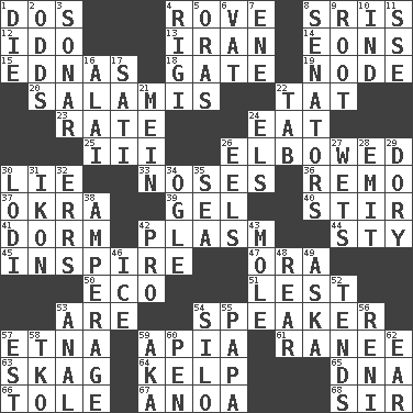 ACROSS 1. Two (Sp.) 4. Be footloose 8. Indian titles of respect 12. Wedding promise 13. SW Asia republic 14. Immeasurably long periods of time 15. Ferber et al. 18. Yard entry 19. Thickened enlargement 20. Deli grouping 22. Make lace 23. Pace 24. Erode 25. One more than two 26. Shoved, as through a crowd 30. Untruth 33. Olfactory organs 36. San ____ (Riviera town) 37. Gumbo ingredient 39. Set 40. Tumult 41. Dormintory (informal) 42. Suffix with ecto or cyto 44. Filthy place 45. Heighten or intensify 47. Mouth or opening 50. Environmental prefix 51. For fear that 53. "We ___ not amused" (Victoria) 54. Orator 57. Inactive volcano in Sicily 59. Capital of Western Samoa 61. Indian princess (variant) 63. Heroin 64. Seaweed 65. Heredity factor (abbr.) 66. Lacquered or enameled metalware 67. Small Philippine buffalo 68. Title for a knight DOWN 1. Pass on 2. Likelihood 3. Underwater navigation system 4. Swiss mountan, "Queen of the Mountains" 5. Mouths or openings 6. Large container 7. Compass dir. 8. Elected representatives 9. Carrot, for example 10. Indiana (abbr.) 11. Compass dir. 16. Jai _ 17. Suttee (variant) 21. Count _ (2 wds.) 22. Bar bill 24. Raised railways 26. Snakelike fish 27. Soaks 28. Send forth 29. Rowboat 30. Farming town in central California 31. Picture 32. Blunders 34. Stare at amorously 35. Ocean 38. Electrical Measurement 42. Adept person 43. Undercover agent 46. Frozen water 48. Hitchcock's "____ Window" 49. "____ silly question..." 52. Looks after 53. Of or related to the anus 54. Grain storage tower 55. Dad 56. Painter Guido (1575-1642) 57. Eastern Standard Time (abbr.) 58. Ring climax 59. Alias (abbr.) 60. Writing instrument 62. Ewer handle