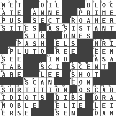 ACROSS 1. Was introduced to 4. Lubricate 7. Group of countries in special alliance 11. Had dinner 12. Singer Murray 13. First class 14. Product of festering 15. Religious group 16. Wanderer 17. Settings 19. Aide 21. Title for a knight 23. Singles 24. Romantic infatuation 25. Raised railways 26. Medical imaging device (abbr.) 29. Cartoon dog 30. To separate or throw off 31. Car or cant ending 32. Observe 33. Indiana (abbr.) 34. White ___ sheet 35. Bar bill 36. _-fi 37. Odor 40. "We ___ not amused" (Victoria) 41. Area sheltered from the wind 42. Guess 43. Glance over 45. A really long time 46. Decision 51. Motion picture award 55. Foolish or stupid persons 56. Rights 58. Mouth or opening 59. Having high moral qualities 60. Writer Wiesel 61. Luau accessory 62. Celtic language 63. Elected rep. 64. Daniel's nick name DOWN 1. Atlas contents 2. Needle holder 3. Trial 4. Single 5. South American Indian 6. Allows 7. Naughty children 8. Pale green bean 9. Presage 10. An absolute certainty 12. Help 13. Introduce or present, as a question 16. Remove soap 18. Son of Isaac 20. Having a sole or soles 22. 17th letter of the Greek alphabet 24. First-year military academy student 25. Bert's buddy 26. Intended 27. Relief 28. _ tizzy (2 wds.) 29. Lightbulb-shaped fruit 32. R.R. building 33. Ancient Celtic tribe of eastern Britain 36. Narrow boards 37. Compass dir. 38. Opt 39. Immeasurably long periods of time 43. Took without asking 44. Quote 46. Trig term 47. Scent 48. Chest bones 49. Lyric poems 50. The longest river in the world 52. Chilled 53. Type of rug 54. Water falling in drops from the sky 57. Storage container