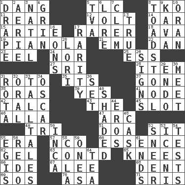 ACROSS 1. Mild oath, euphamism for damn 5. Affectionate concern, for short 8. Ring climax 11. Located in or toward the back 12. Electrical Unit 14. Boat paddle 15. Nick name for Arthur 17. More uncommon 18. Actress Gardner 19. Player piano 21. Australian flightless bird 22. Daniel's nick name 23. Snakelike fish 24. And not 25. Double-curved letter 27. Indian title of respect (Mr.) 28. A distinct part 31. Printing process, for short 35. ___ a Wonderful Life 37. Went 38. Mouths or openings 39. Affirmative reply 41. Thickened enlargement 42. Baby powder 43. Definite Article 45. Position in a hierarchy or organization 46. Silent film actress Nazimova 47. Curve 49. Three (prefix) 51. ___ good deed 52. Be seated 55. Epoch 57. Non-commissioned officer (abbr.) 60. Core 62. Set 63. Continued (abbr.) 65. Leg joints 66. Binary compound 67. Toward shelter 68. Gouge 69. Mayday 70. White ___ sheet 71. Indian titles of respect DOWN 1. Window treatment 2. Nest on high 3. Relating to or accompanying birth 4. Broad smile 5. Federal power corp. 6. Old wives' tales, e.g. 7. Clement's nick name 8. Inedible or poisonous agaric 9. Polynesian shrub of the pepper family 10. Northwest Algerian city 13. Loyal 16. Immeasurably long periods of time 17. Noteworthy scarcity 20. Australian parrot (variant) 26. Public displays of written messages 29. Inside; within (prefix) 30. Rendezvous 31. Round or rotation of duties 32. Spoken 33. Baron Munchausen's specialties 34. Witty Wilde 36. Arrange properly for use 40. Cast a shadow over 44. Greek god of love 48. Keg 50. South American Indian 52. Contemptuous expression 53. Ancient Celtic tribe of eastern Britain 54. Trials 55. The front part of a cuirass 56. Make new 58. Root beer relative 59. Washington bills 61. Extremities 64. Afternoon social gathering