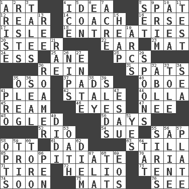 ACROSS 1. Nonscientific branch of learning 4. The main thing one is thinking about 8. Petty quarrel 12. Located in or toward the back 14. Team commander 16. Celtic language 17. Small island 18. Pleas 20. Guide 22. Hearing organ 23. Floor covering 24. Curvy letter 25. One (Scot) 28. Personal Computers (abbr.) 30. It's straight from the horse's mouth 31. Arguments over trivial matters 35. Bear (Spanish) 37. Groovy apts. 40. Mitch Miller's instrument 41. Entreaty 42. Lacking originality or spontaneity 44. Rounded earthenware pot or jar 45. 480, 500 or 516 sheets of paper 46. Snake ____ (dice throw) 47. Born 48. Stared at amorously 50. 24-hour periods 52. _ de Janeiro 54. Institute legal proceedings 55. Plant excrement 58. Baseball player Mel 61. June honoree 63. Free from disturbance or agitation 65. Appease 70. Roberta Peters solo 71. Become fatigued 72. Sun: prefix 73. Portable shelter 74. Within a short period 75. Floor coverings 76. Observe DOWN 1. Originate 2. Musical pauses 3. Stories 4. Frozen water 5. Spanish title 6. Ingest 7. 1/640 square mile 8. Put into a specified state 9. Demure 10. Toward the sea 11. Trial 13. Portuguese money of account (variant) 15. Pile 19. Curves 21. Actress Charlotte 26. Cuts off 27. Maternal 29. Soup utensils 30. Wanderer 32. Competent 33. Lacquered or enameled metalware 34. Ocean 35. Cassini of fashion 36. Lick closed 38. 24 hours 39. Bobsleighs 41. Adept person 43. Son of Isaac 49. "You Light Up My Life" star Conn 51. Consenting reply 53. Pledge 55. Male parents of animals 56. Place in a line 57. Food holder 58. Chooses 59. Musical group of three 60. "Corrida" creature 62. South Vietnam president (1954) 64. Make lace 66. Fenced enclosure 67. Chicken ___ king 68. Teat (slang) 69. Greek goddess of the dawn