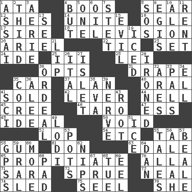 ACROSS 1. _ moment's notice (2 wds.) 4. Expressions of contempt or scorn 8. Wither 12. "______ My Girl" (Turtles hit) 14. Join together 16. Stare 17. The founder of a family 18. Household entertainment appliance 20. Satellite of Uranus 22. Nervous spasm 23. Arrange properly for use 24. Binary compound 25. One more than two 28. Flowery wreath 30. Chooses 31. Window treatment 35. 4-wheeled motor vehicle 37. Actor Alda or Thicke 40. Of the mouth 41. Disposed of to a purchaser 42. Prying instrument 44. 1994 drama film starring Jodie Foster 45. Algonquian 46. Pacific island yam 47. Double-curved letter 48. Standard of perfection 50. Empty area or space 52. Trim (branches) 54. And so on (abbr.) 55. Bar bill 58. Chewing product 61. Spanish title 63. Peak District village in England 65. Conciliate 70. Silent film actress Nazimova 71. "Two Mules for Sister ____" 72. Disorder 73. Actress Patricia 74. Downhill vehicle 75. Stitch closed the eyes of (a falcon) 76. A female animal or person DOWN 1. Slender Brazilian palm 2. One of three equal parts 3. Nest on high 4. On the contrary 5. Single 6. Petroleum 7. Proofreading order 8. Distress signal 9. The front part of a cuirass 10. _ vera 11. Monthly bill 13. Perceive with the eye 15. Tending to cause great harm 19. On the rocks 21. Mouth edge 26. Slanted text style (abbr.) 27. Small island 29. Pressed 30. Severe or trying experience 32. Ancient Greek god of war 33. Friends 34. Pipe bend 35. Drawstring 36. Toward shelter 38. Actress Gardner 39. Impudent aggressiveness 41. _-fi 43. Carrot, for example 49. Farming town in central California 51. Frozen water 53. Cooking vessels 55. Falsehoods 56. Assad's deity 57. Calif. Air Force Base 58. Global Positioning Systems (abbr.) 59. Mountain range 60. Greater amount 62. Pinches, bites 64. Daniel's nick name 66. Groovy apt. 67. "We ___ not amused" (Victoria) 68. Third day of the wk. 69. Snakelike fish