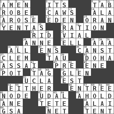 ACROSS 1. So be it 5. ___ a Wonderful Life 8. Keyboard key 11. Loose flowing garment 12. Crow sounds 14. In the manner of 15. Came up 17. Locale of original sin 18. Northwest Algerian city 19. Gossips 21. Food allowance for one day 23. To free from 25. Small bottle 26. Queen of England 1702-14 27. Pipe bend 28. American Automobile Association (abbr.) 31. Everything 33. Followers of ems 35. 2nd pers. sing. pres. of can (arch.) 37. Clement's nick name 38. The 19th letter of the Greek alphabet 40. Capital of the state of Qatar 41. Slender Brazilian palm 43. Before (prefix) 45. Compass dir. 46. Plant holder 47. Label 50. Small, secluded valley 52. Southern CA. univ. 53. Eastern Standard Time (abbr.) 54. One or the other of two 56. Main course 61. Connecting point 62. Hereditary estate 65. Hold, grip (Informal) 66. One (Scot) 67. Wig 68. Jai _ 69. Girls' org. (abbr.) 70. Remaining after all deductions 71. Portable shelter DOWN 1. Like ___ of sunshine 2. Greater amount 3. Inky black, to poets 4. A home for chicks 5. Frozen water 6. Small boy 7. Turn aside suddenly 8. Edible starchy tuberous root 9. Actor Alda or Thicke 10. Prohibit 13. Slow-paced one 16. Merit 18. Lubricate 20. Trig term 22. Baby powder 24. Undesirable depression on a surface 26. _ mater 28. At once, immediately (arch.) 29. American tennis player Robert 30. "One Day ___ Time" 31. In addition 32. For fear that 34. Plant excrement 36. Arabian gulf 37. Head covering 39. Goad 42. Hankering 44. Otherwise 48. Native American of Southwest Alaska 49. Place where plants grow 51. Inactive volcano in Sicily 52. Shoshoni 54. Immeasurably long periods of time 55. The main thing one is thinking about 57. Not this but _ 58. Hero or heavy, e.g. 59. Style 60. Prepare for publication 61. Tired old horse 63. Had dinner 64. Allow