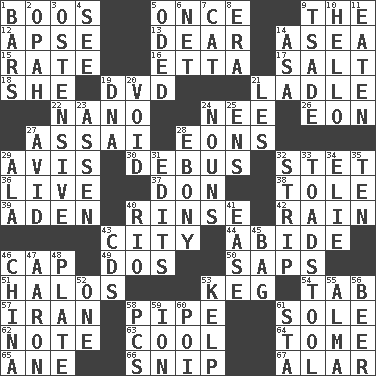 ACROSS 1. Expressions of contempt or scorn 5. Single time 9. Definite Article 12. Domed church section 13. Letter starter 14. Toward the sea 15. Assign a rank or rating to 16. Singer James 17. Table seasoning 18. A female animal or person 19. Movie disc 21. Dipping utensil 22. Billionth: prefix 24. Born 26. Period of immesurable duration 27. Slender Brazilian palm 28. Immeasurably long periods of time 29. Deliberation 30. Alight from a bus 32. Proofreading order 36. Not recorded 37. Spanish title 38. Lacquered or enameled metalware 39. An important port of Yemen 40. Remove soap 42. Precipitation 43. Municipality 44. Tolerate 46. Head covering 49. Two (Sp.) 50. Plant excrements 51. Radiant circles of light 53. Cask 54. Keyboard key 57. SW Asia republic 58. Corncob 61. Not divided or shared with others 62. Make mention of 63. Calm and collected 64. Heavy book 65. One (Scot) 66. Sever or remove by pinching or nipping 67. Having or resembling wings DOWN 1. Soap units 2. Brightly colored fish 3. Clearly or manifestly demonstrative 4. Perceive with the eye 5. Wrote a lyric poem 6. Fish or hair follower 7. Feline 8. Period 9. Sadhe (variant) 10. Phone greeting 11. Eroded 14. White ___ sheet 19. Heredity factor (abbr.) 20. Null 21. French article 23. NE Netherlands city 24. Parts of speech 25. Followers of ems 27. Enthusiastic 28. Black 29. Chicken ___ king 31. Proofreads 32. Remove all contents or possession from 33. Inedible or poisonous agaric 34. Writer Wiesel 35. Nine, plus one 40. River (Sp.) 41. Comfort 43. Music discs 45. Container for groceries 46. Large country 47. Composer Copland 48. Food holder 52. Single 53. Seaweed 55. _ mater 56. Fermented drink made from hops 58. Personal Computers (abbr.) 59. Electrically charged atom 60. Luau course 61. R.R. building
