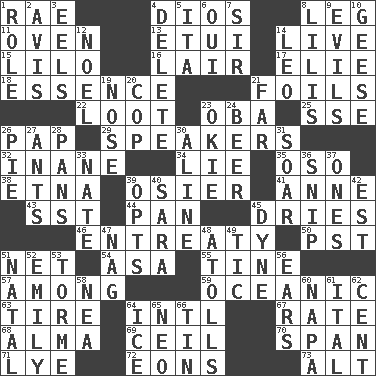 ACROSS 1. Actress Charlotte 4. "Vaya con ____" 8. Part of a journey 11. Baking chamber 13. Needle holder 14. Moving, as bait 15. _ and Stitch 16. Den 17. Writer Wiesel 18. Core 21. Fencing necessities 22. Plunder 23. Chief or king in Benin or Nigeria 25. Compass dir. 26. Infant food 29. Orators 32. Lacking in sense or substance 34. Falsehood 35. Bear (Spanish) 38. Inactive volcano in Sicily 39. Flexible twig of a willow tree 41. Singer Murray 43. Fast jet (abbr.) 44. Baking dish 45. Frees from moisture 46. Plea 50. Pacific Standard Time (abbr.) 51. Fish or hair follower 54. White ___ sheet 55. Prong on a fork 57. Amid 59. Pertaining to the sea 63. Hoop that covers a wheel 64. International (abbr.) 67. Assign a rank or rating to 68. _ mater 69. To provide with a ceiling 70. Connect, as a bridge 71. Sodium hydroxide 72. Immeasurably long periods of time 73. The first octave above the treble staff DOWN 1. Hero or heavy, e.g. 2. Opinion 3. Snakelike fish 4. Erase 5. Call ___ day 6. Fr. "Yes" 7. Title for a knight 8. Ms. Damita and namesakes 9. Vices 10. Honkers 12. Christmas carol 14. Lion 19. Olfactory organ 20. Police officer (slang) 21. At a great distance 23. Migrant worker of the '30s 24. Fermented drink made from hops 26. Sliced dessert 27. Pismires 28. Baking dishes 30. Place in a line 31. Fly high 33. Nathan's nickname 36. Clip 37. Singles 39. Elects 40. "Two Mules for Sister ____" 42. Eastern Standard Time (abbr.) 45. Unit of force 47. Tired old horse 48. Ringlike coral islands and reefs 49. Nervous spasm 51. Relating to or accompanying birth 52. Poet Dickinson 53. Singer Mel 56. Hearing organs 58. Teachers' org. 60. California wine valley 61. Slanted text style (abbr.) 62. Penny 64. Frozen water 65. Modern: prefix 66. Shallow baking pan