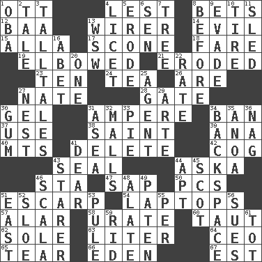 ACROSS 1. Baseball player Mel 4. For fear that 8. Stakes 12. Sound made by sheep 13. One who wires 14. Tending to cause great harm 15. Silent film actress Nazimova 17. Biscuitlike quick bread 18. Conductor's collection 19. Shoved, as through a crowd 21. Worn away 23. "___ Little Indians" 24. Beverage made from leaves 26. "We ___ not amused" (Victoria) 27. Nathan's nickname 28. Yard entry 30. Set 31. Electrical Unit 34. Bar 37. Purpose 38. Virtuous person 39. Santa ___, CA 40. Mountains (abbr.) 41. Keyboard key 42. Gear tooth 43. Lick closed 44. "____ silly question..." 46. R.R. building 47. Plant excrement 50. Personal Computers (abbr.) 51. Fortification 54. Portable computers 57. Having or resembling wings 58. A salt of uric acid 60. Strained 62. Not divided or shared with others 63. 61 cubic inches 64. Corporate head (abbr.) 65. Lacerate 66. Locale of original sin 67. Eastern Standard Time (abbr.) DOWN 1. Chief or king in Benin or Nigeria 2. Falsehood 3. Baron Munchausen's specialties 4. It is permitted: Lat. 5. Wear away 6. Elected rep. 7. Family _ (genealogy) 8. Prior to 9. Dodge 10. Hoop that covers a wheel 11. Downhill vehicle 13. Compass dir. 16. Collude with 20. Single 22. Assign a rank or rating to 25. Rep 27. Egg locale 29. Johnson of "Laugh-In" 30. Chewing product 31. At sea 32. Shopping centers 33. Sliced dessert 34. Keyboard key 35. Small Philippine buffalo 36. Tired old horse 41. Letter starter 43. A viewer who gazes fixedly 44. Fitting 45. Native of Scotland 46. Any of the three canals of the cochlea 48. Having winglike extensions 49. Eucharist need 51. Compass direction 52. A type of plum 53. Whimper 55. For each 56. Takes to court 59. To free from 61. Small child