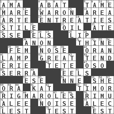 ACROSS 1. Housemaid (var.) 4. Blind as ____ 8. Not wild 12. Female horse 14. Make _____ (do battle with) 16. Length times width 17. Johnson of "Laugh-In" 18. Pleas 20. Vertical member of a panel or frame 22. Lubricate 23. Had dinner 24. Compass dir. 25. Raised railways 28. Mouth edge 30. Soon (poet.) 31. One or ones belonging to thee 35. Opposite of masc. 37. Olfactory organ 40. Northwest Algerian city 41. Desk light 42. Relatively large 44. Watch over 45. One of the Great Lakes 46. False hair 47. Bear (Spanish) 48. Father Junipero _ 50. Snakelike fish 52. Compass dir. 54. Compass dir. 55. A female animal or person 58. Mouth or opening 61. Krazy ___ of comics 63. Southeast Indonesia island 65. Complicated, petty procedures 70. Tall New Zealand timber tree 71. Toward shelter 72. Annoying sound 73. Actor Baldwin 74. For fear that 75. Trial 76. Eastern Standard Time (abbr.) DOWN 1. Collect or gather 2. Shops 3. Nick name for Arthur 4. Deep reverence 5. Forbid 6. Nonscientific branch of learning 7. "Corrida" creature 8. Make lace 9. Operatic vocal solo 10. Confront 11. Comfort 13. Snakelike fish 15. Famous astronaut Armstrong 19. Set down 21. Car or cant ending 26. Protracted 27. Derisive sound 29. Pictures 30. Electrical Unit 32. Angers 33. Billionth: prefix 34. Conclude 35. Conductor's collection 36. Arab leader 38. Perceive with the eye 39. Eroded 41. French article 43. Adolescent 49. "____ silly question..." 51. Allow 53. Merit 55. Grin 56. Dwellings 57. Spew [out] 58. Relating to the mouth 59. Cause heat under the collar 60. Eons 62. A blast of a horn 64. Lyricist Gershwin 66. Was introduced to 67. Whopper 68. Curvy letter 69. Put into a specified state