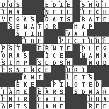 ACROSS 1. Two (Sp.) 4. Singer Brickell 8. Opportunity 12. _ tizzy (2 wds.) 13. Famous astronaut Armstrong 14. Georgia ____ (Atlanta school) 15. Viva Las _ 18. Raised platform 19. Assign a rank or rating to 20. Legislator 22. Atlas unit 23. Use a swizzle stick 24. Large container 25. Binary compound 26. Photo 30. Pacific Standard Time (abbr.) 33. Bert's buddy 36. Cassini of fashion 37. Mouths or openings 39. Frozen water 40. Grandmother 41. Simple or foolish person 42. Make a splashing sound 44. Allow head to fall sleepily 45. Center 47. RI univ. 50. Black tropical American cuckoo 51. Allows 53. Make supply last 54. Manned the helm 57. Docile 59. Hearing organs 61. Underwater navigation system 63. Arab leader 64. Morally bad or wrong 65. Mouth or opening 66. Tenement units (abbr.) 67. Unable to walk 68. To sift DOWN 1. HTML Container Element 2. Washington bills 3. Gurus 4. Inside; within (prefix) 5. Letter starter 6. One more than two 7. Raised railways 8. Ski resort town in Vermont 9. Pile 10. Sep. follower 11. Definite Article 16. Opposed to 17. Stated 21. Woody plant 22. Apple computer (short form) 24. Compete 26. Sliced desserts 27. ____ Bator 28. Former U.S. Attorney General Janet 29. Mild oath 30. Introduce or present, as a question 31. Indian titles of respect 32. Scottish caps 34. Cause heat under the collar 35. Non-commissioned officer (abbr.) 38. Orators 42. _-fi 43. Frame or body of a ship 46. Compass dir. 48. Vintage cars 49. "Tell ____ the Marines!" 52. Sir (Sp.) 53. Give off 54. Demure 55. Capri or Wight 56. Have the gumption 57. Beverage made from leaves 58. Electrical Unit 59. Snakelike fish 60. Actress Gardner 62. Actress Charlotte