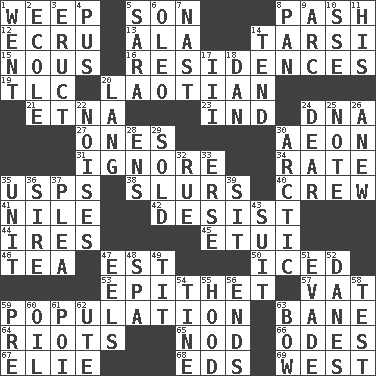 ACROSS 1. Shed a tear 5. Male offspring 8. Romantic infatuation 12. Shade of tan 13. Insect wing 14. Tarsus (plural) 15. Common sense 16. Homes 19. Affectionate concern, for short 20. Of or relating to Laos or its people 21. Inactive volcano in Sicily 23. Working for oneself (abbr.) 24. Heredity factor (abbr.) 27. Singles 30. Period of immesurable duration 31. Disregard 34. Pace 35. United States Postal Service (abbr.) 38. Plays smoothly or legato 40. Group working together 41. "Death on the ____" 42. Stop 44. Angers 45. Needle case 46. Beverage made from leaves 47. Eastern Standard Time (abbr.) 50. On the rocks 53. Curse 57. Large container 59. Census information 63. Object of repulsion 64. Disturbances 65. Lower and raise head in agreement 66. Lyric poems 67. Writer Wiesel 68. Begley and Asner 69. 270 degrees DOWN 1. Left 2. Learning spot: Fr. 3. Spew [out] 4. Product of festering 5. "Two Mules for Sister ____" 6. Margarine 7. Political cartoonist Thomas 8. Baking dish 9. Curve 10. Compass dir. 11. Part of HMS, perhaps 14. Be inclined (to) 17. One more than two 18. One of the 12 tribes of Israel 20. Austrian-born American filmmaker Fritz 22. Annoying sounds 24. Letter starter 25. Make mention of 26. Afresh 28. Followers of ems 29. Disposed of to a purchaser 30. Northern region 32. Regret 33. Celtic language 35. A single undivided whole 36. Beget 37. Entreaty 39. Be seated 43. Set of matching outer garments 47. Snakelike fish 48. Health resort 49. Teat (slang) 51. Elude 52. Natives or inhabitants of Denmark 54. Prong on a fork 55. Parka part 56. Extremities 58. Trial 59. Before (prefix) 60. Lubricate 61. Luau course 62. Shoshoni 63. Arrow shooter