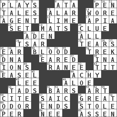 ACROSS 1. Romps 6. _ moment's notice (2 wds.) 9. Animal enclosure 12. Lies 13. Having or resembling wings 14. Had on 15. Rep 16. Citrus frut 17. Capital of Western Samoa 18. Put into a specified state 19. Floor protectors 20. A slight indication 21. An important port of Yemen 23. 100% 24. Russian ruler of old 25. Pulls into pieces 28. Ewer handle 30. Vital fluid 34. Long journey 35. Heredity factor (abbr.) 36. Having ears or earlike features 38. _ tizzy (2 wds.) 39. Charged particles 41. The wife of a rajah (variant) 43. Teat (slang) 44. Artist's stand 46. Painful 48. Area sheltered from the wind 49. _ vera 50. Bits 51. Soap units 53. Nonscientific branch of learning 56. Quote 57. Ketch in the Levant 58. Relatively large 60. Aroma 61. Conclusions 62. Fur scarf 63. For each 64. Born 65. NE Netherlands city DOWN 1. Parent Teacher Association (abbr.) 2. Fails to keep up a pace 3. Toward shelter 4. Gossips 5. Fast jet (abbr.) 6. Set down 7. Scottish caps 8. "We ___ not amused" (Victoria) 9. Teen's desire 10. 4th largest of the Great Lakes 11. Teachers' org. 13. Actor Alda or Thicke 14. Place for singles 19. Haggard of country music 20. Domesticated feline 22. Small moist lump or mass 24. Interpreter 26. Painter Guido (1575-1642) 27. Three-handed card game 28. Singer Brickell 29. Small Philippine buffalo 31. Rowing implement 32. Mouth or opening 33. Lair 37. Allots cards 40. Sowing specialist 42. Environmental prefix 45. French article 47. Centers 49. Curves 50. Event that recurs at intervals 51. Object of repulsion 52. Helper 54. Vintage cars 55. Falsehood 56. Police officer (slang) 57. Elected rep. 58. Girls' org. (abbr.) 59. "___ Little Indians"