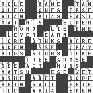 ACROSS 1. Hero or heavy, e.g. 5. Object of repulsion 9. Scottish cap 12. Butter sub 13. Washington bills 14. Celtic language 15. Actor Alda or Thicke 16. Prejudice 17. Compass direction 18. Floor protector 19. Mountains (abbr.) 21. A person who is older than you are 22. Like (prefix) 24. Untruth 26. Compass dir. 27. Prying instrument 28. Merit 29. Old wives' tales, e.g. 30. Pig sounds 32. 43,560 square feet 36. An important port of Yemen 37. Compass dir. 38. Supercomputer manufacturer 39. Auction offers 40. Runs notes together 42. Casino tip 43. Family _ (genealogy) 44. Came up 46. Observe 49. Small island 50. Religious women 51. Taiwanese island in East China Sea 53. Compass dir. 54. Dripping 57. American tennis player Robert 58. Collude with 61. Thickened enlargement 62. It's straight from the horse's mouth 63. Table seasoning 64. One of the Great Lakes 65. Affectionate concern, for short 66. Operatic vocal solo 67. Paradise DOWN 1. Wander aimlessly 2. Spanish pot 3. Resembling or made to resemble leather 4. Period of immesurable duration 5. Moves up and down 6. Cuckoo 7. Teachers' org. 8. Curvy letter 9. Buy and sell 10. NE Netherlands city 11. Distance measurement (Brit.) 14. Snakelike fish 19. Madame (abbr.) 20. "Corrida" creature 21. Car or cant ending 23. Baking chambers 24. Member of a famous L.A. basketball team 25. Big collection agency 27. Farming town in central California 28. Follow as a consequence or result 29. Experiment locale 31. Small island 32. Gambison 33. What you're doing now 34. Libertine 35. Sight organ 40. _ Lanka 41. Without 43. The 19th letter of the Greek alphabet 45. Sorrow 46. Don Adams' spy role 47. Artist's stand 48. Principle of right and wrong 52. Elected rep. 53. Singer James 55. Singer Brickell 56. Adolescent 58. White ___ sheet 59. Drinking establishment 60. Biblical high priest 61. Born