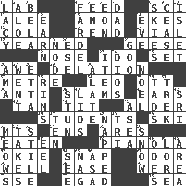 ACROSS 1. Experiment locale 4. Nourish 8. _-fi 11. Toward shelter 13. Small Philippine buffalo 14. Supplements with great effort 15. Root beer relative 16. Tear apart 17. Small bottle 18. Had a strong desire 21. Honkers 22. Characteristic smell of wine 23. Wedding promise 25. Put into a specified state 26. Deep reverence 29. Conveyance 32. Distance measurement (Brit.) 34. Lion 35. Baseball player Mel 38. Opposed to 39. Shuts with force 41. Hearing organs 43. Scottish cap 44. Teat (slang) 45. Tree or shrub in the Birch family 46. SAT takers 50. What Jean-Claude Killy likes to do 51. Mountains (abbr.) 54. Followers of ems 55. Ancient Greek god of war 57. Consumed 59. Player piano 63. Migrant worker of the '30s 64. Fastener 67. Scent 68. Water source 69. Comfort 70. We are 71. Compass dir. 72. Mild oath 73. Ocean DOWN 1. Made of lace 2. Medicinal plant 3. Actor Lugosi 4. Burden 5. Compass dir. 6. Period of immesurable duration 7. June honoree 8. Atmospheres 9. Desist 10. Small island 12. Merit 14. First lady 19. Connecting point 20. Compass dir. 21. Thick or sticky substance 23. A distinct part 24. "Vaya con ____" 26. Wet nurse (var.) 27. Gone 28. Singer James 30. Having winglike extensions 31. Christmas carol 33. Basketball hoops 36. Small boys 37. Long journey 39. Astound 40. Hats (slang) 42. _ Lanka 45. Toward the sea 47. Nine, plus one 48. Slept 49. Three (prefix) 51. Catcalls? 52. Receives possession of 53. Vertical member of a panel or frame 56. Frozen precipitation 58. Snakelike fish 60. Lyric poems 61. Old wives' tales, e.g. 62. Type of rug 64. Observe 65. Tired old horse 66. White ___ sheet