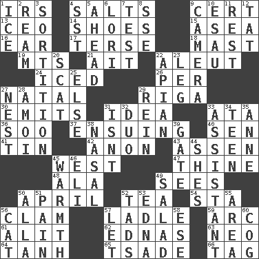 ACROSS 1. Big collection agency 4. Table seasonings 9. An absolute certainty 13. Corporate head (abbr.) 14. Imelda's hoard 15. At sea 16. Ewer handle 17. Laconic 18. Vertical spar for supporting sails 19. Mountains (abbr.) 21. Small island 22. Eskimo relative 24. On the rocks 26. For each 27. Brizilian seaport 29. Port city in Latvia 30. Gives off 31. It may be bright or harebrained 33. "One Day ___ Time" 36. "Barney Miller" actor Jack 37. Taking place subsequently 40. Elected rep. 41. Metal container 42. Soon (poet.) 43. NE Netherlands city 45. 270 degrees 47. One or ones belonging to thee 48. Chicken ___ king 49. Observes 50. Showery time 52. Afternoon social gathering 54. R.R. building 56. Dollar (slang) 57. Dipping utensil 59. Curve 61. Came down and settled, as after flight 62. Ferber et al. 63. Modern: prefix 64. Hyperbolic tangent 65. Sadhe (variant) 66. Label DOWN 1. Frozen water 2. 480, 500 or 516 sheets of paper 3. Drawing lots 4. Fast jet (abbr.) 5. Forward in time 6. Australian parrot (variant) 7. Trial 8. Compass dir. 9. Device for capturing images 10. He sold his birthright 11. Take ten 12. Make lace 20. Scram, to a cat 22. Bee-related 23. Part of a journey 25. Otherwise 27. Egg locale 28. Mine, in Marseilles 29. It's straight from the horse's mouth 31. Is not 32. Superhero pair 33. Helper 34. Adolescent 35. Singer Murray 38. Rhinal 39. Yard entry 44. "______ My Girl" (Turtles hit) 45. Heat 46. Connecticut Ivy Leaguer 49. Vegetable dish 50. Silent film actress Nazimova 51. Ache 52. Small amounts or degrees 53. Pulitzer Prize-winning author Ferber 55. Length times width 56. Domesticated feline 57. Allow 58. Compass dir. 60. Gear tooth