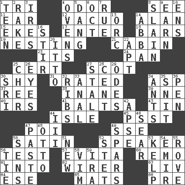 ACROSS 1. Three (prefix) 4. Aroma 8. Perceive with the eye 11. Hearing organ 12. In a vacuum (with "in") 14. Actor Alda or Thicke 15. Makes supply last 17. Keyboard key 18. Long, evenly shaped pieces 19. Nestling 21. Apartment or room in a ship 23. It is 24. Baking dish 25. Certainty 27. Native of Scotland 30. Like a shrinking violet 31. Declaimed 34. Viper 37. To sift 38. Lacking in sense or substance 39. Compass dir. 40. Big collection agency 41. Greek mezzo-soprano Agnes 43. Metal container 44. Small island 45. Inconspicuous attention getter 47. Luau course 49. Compass dir. 50. Smooth fabric 52. Orator 56. Trial 57. Webber/Rice musical 60. San ____ (Riviera town) 61. To the inside or interior of 62. One who wires 63. 54 in ancient Rome 64. Compass dir. 65. Floor coverings 66. Before (prefix) DOWN 1. Adolescent 2. Immoral or dissolute person 3. Angers 4. Baking chambers 5. Mild oath, euphamism for damn 6. Sep. follower 7. Regret 8. Killed 9. Merit 10. Followers of ems 13. The grampus (Milton) 14. Swedish rock group 16. Use a spoon 20. "Tell ____ the Marines!" 22. Fitting 25. "Mermaids" star 26. Sight organs 27. Having lost freshness 28. Penny 29. Lyric poems 30. _ Lanka 32. Chest bones 33. Of or related to the anus 34. Pismires 35. In a ____ (agitated or irritated) 36. Writing instrument 42. Domed church section 44. One more than two 46. Wither 47. Thick mixture 48. "Beetle Bailey" pooch 49. Practice fights 50. Elected reps. 51. ___ Haven, CT 52. Proofreading order 53. Seaweed 54. Independent ruler or chieftain 55. Be footloose 56. Neckwear 58. Zeal 59. Lyricist Gershwin