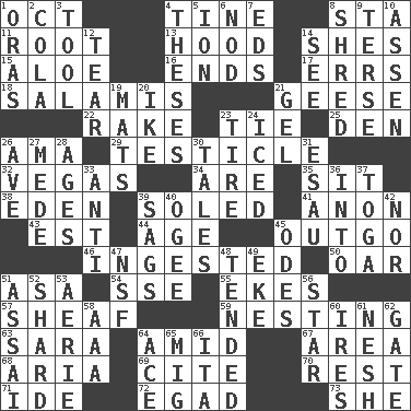 ACROSS 1. Sep. follower 4. Prong on a fork 8. R.R. building 11. Carrot, for example 13. Parka part 14. "______ My Girl" (Turtles hit) 15. _ vera 16. Extremities 17. Blunders 18. Deli grouping 21. Honkers 22. Immoral or dissolute person 23. Standoff 25. Lair 26. Housemaid (var.) 29. A testis 32. Viva Las _ 34. "We ___ not amused" (Victoria) 35. Be seated 38. Locale of original sin 39. Having a sole or soles 41. Soon (poet.) 43. Eastern Standard Time (abbr.) 44. Personal question 45. Outlay 46. Eaten 50. Rowing implement 51. White ___ sheet 54. Compass dir. 55. Supplements with great effort 57. To gather and bind into a bundle 59. Nestling 63. "Two Mules for Sister ____" 64. Among 67. Type of rug 68. Operatic vocal solo 69. Quote 70. Respite 71. Binary compound 72. Mild oath 73. A female animal or person DOWN 1. Mouths or openings 2. Root beer relative 3. Implement 4. College papers 5. Electrically charged atom 6. Allow head to fall sleepily 7. Begley and Asner 8. Fragment 9. Laconic 10. NE Netherlands city 12. Lacerate 14. Observe 19. Floor protectors 20. D.D.E's nickname 21. Set 23. Hoop that covers a wheel 24. On the rocks 26. "___ Maria" 27. Ancient Persian 28. Eons 30. Falsehoods 31. Son of Isaac 33. Opposed to 36. To the inside or interior of 37. Ancient Roman robe 39. Droops 40. Double curve, resembling the letter S 42. And not 45. Lyric poems 47. Science/research agcy. 48. Looked after 49. Supplement with great effort 51. Slender Brazilian palm 52. Broken piece 53. Nest on high 56. Play the lead 58. Auto club (abbr.) 60. Angers 61. Delicate 62. Yard entry 64. Adept person 65. Russian fighter aircraft 66. Call ___ day