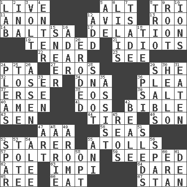 ACROSS 1. Not recorded 5. Keyboard modifier key 8. Three (prefix) 11. Soon (poet.) 12. Advice 13. Friend of Pooh 14. Greek mezzo-soprano Agnes 17. Accusation by an informer 19. Looked after 21. Foolish or stupid persons 22. Bring up, as a child 23. Perceive with the eye 24. Parent Teacher Association (abbr.) 27. Greek god of love 29. A female animal or person 32. Failure 34. Heredity factor (abbr.) 36. Entreaty 37. Celtic language 38. Greek goddess of the dawn 39. Table seasoning 40. So be it 41. Two (Sp.) 42. Instruction Manual for Humans 43. Elected rep. 44. Hoop that covers a wheel 46. Manchild 47. American Automobile Association (abbr.) 50. Oceans 52. A viewer who gazes fixedly 55. Ringlike coral islands and reefs 57. Coward 59. Oozed 62. Had dinner 63. Body of Kaffir warriors 64. Have the gumption 65. To sift 66. Consume 67. Comedian Laurel of Laurel & Hardy DOWN 1. Experiment locale 2. _ tizzy (2 wds.) 3. Electrical Unit 4. Keyboard key 5. "___ Maria" 6. Ms. Damita and namesakes 7. Sadhe (variant) 8. Musical group of three 9. Carrot, for example 10. Charged atoms 12. Increase 15. Contemptuous expression 16. The sixth month of the Jewish calendar 18. Standoff 20. Eaten away 24. Entreaties 25. Singer Mel 26. NE Netherlands city 28. Snout, nose 29. Broad, flat, thick pieces 30. Phone greeting 31. Consumed 33. Car or cant ending 35. Aid 36. Air pressure measure (abbr.) 42. Memphis, Tenn. Street 45. Vintage cars 47. Tate display 48. Nest on high 49. Odor 51. Bobsleighs 52. Coast Guard woman 53. Carry 54. Toward shelter 55. Black tropical American cuckoo 56. Argument over a trivial matter 58. Elect 60. Epoch 61. Lair