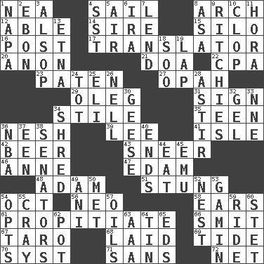ACROSS 1. Teachers' org. 4. Move on water 8. Bowlike part 12. Competent 14. The founder of a family 15. Grain storage tower 16. Mail 17. Interpreter 20. Soon (poet.) 21. ___ good deed 22. Accounting whiz (abbr.) 23. Eucharist need 27. Brightly colored fish 29. Cassini of fashion 31. Attach a signature 34. Vertical member of a panel or frame 35. Adolescent 36. Tender 39. Area sheltered from the wind 41. Small island 42. Fermented drink made from hops 43. Contemptuous expression 46. Queen of England 1702-14 47. Dutch treat 48. First of billions? 51. Feeling sharp psychological pain 54. Sep. follower 56. Modern: prefix 58. Hearing organs 61. Appease 66. Stricken, poetically 67. Edible starchy tuberous root 68. Put down 69. Periodic rise and fall of the sea level 70. System (abbr.) 71. Without 72. Fish or hair follower DOWN 1. California wine valley 2. Inky black, to poets 3. Columnist Joseph or Stewart 4. Fast jet (abbr.) 5. Atmosphere 6. Lyricist Gershwin 7. Grant temporary use of 8. White ___ sheet 9. Actors Guy, Robert Welles, and Clint 10. Hoof sound 11. Israeli folk dance 13. Inactive volcano in Sicily 18. "Barney Miller" actor Jack 19. Infant locale 24. Small child 25. Connecticut Ivy Leaguer 26. 1994 drama film starring Jodie Foster 28. Moving about 30. Honkers 32. Set 33. Compass dir. 34. Tear up 36. Basketball assoc. 37. Car or cant ending 38. Legislators 40. Extremities 44. Erode 45. Australian flightless bird 49. Black tropical American cuckoo 50. Was introduced to 52. Egg locale 53. Street urchin 54. Chooses 55. Supercomputer manufacturer 57. Petroleums 59. Travel on an animal 60. Proofreading order 62. Cooking vessel 63. Auto club (abbr.) 64. Shallow baking pan 65. Begley and Asner