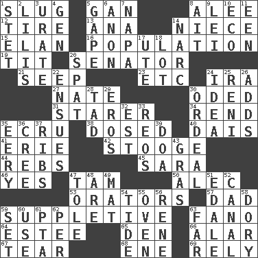 ACROSS 1. A hard, heavy blow 5. Separate the seeds from cotton 8. Toward shelter 12. Hoop that covers a wheel 13. Santa ___, CA 14. Sibling's daughter 15. Flair 16. Census information 19. Teat (slang) 20. Elected representative 21. Ooze 23. And so on (abbr.) 24. Retirement account (abbr.) 27. Nathan's nickname 30. Wrote a lyric poem 31. A viewer who gazes fixedly 34. Tear apart 35. Shade of tan 38. Administered medicine 40. Raised platform 41. One of the Great Lakes 42. Moe Howard, for one 44. Confederate soldiers (slang) 45. "Two Mules for Sister ____" 46. It is so 47. Scottish cap 50. Actor Baldwin 53. Speakers 57. Male parent 59. Supplying deficiencies 63. Papal veil 64. First name in cosmetics 65. Lair 66. Having or resembling wings 67. Rend 68. Compass dir. 69. Have confidence or faith in DOWN 1. Proofreading order 2. Ms. Damita and namesakes 3. A salt of uric acid 4. Commissioned mil. rank 5. Yawn 6. At once, immediately (arch.) 7. California wine valley 8. Small island 9. Flowery wreath 10. Environmental prefix 11. Car or cant ending 14. Drug cop 17. Shoshoni 18. Car dealer's back yard 20. Petty quarrel 22. Takes place subsequently 24. It may be bright or harebrained 25. Painter Guido (1575-1642) 26. Does sums 28. Bit 29. Greek god of love 30. Severe or trying experience 32. Eastern Standard Time (abbr.) 33. Vintage cars 35. Suggestive of the supernatural 36. Algonquian 37. Teases 39. ___ good deed 43. Pate de foie ____ 47. Lacquered or enameled metalware 48. "We ___ not amused" (Victoria) 49. Floor covering 51. Peak District village in England 52. Lessep's creation 54. Periodic rise and fall of the sea level 55. Baking chamber 56. French philosopher Descartes 58. Dinghy 59. Put into a specified state 60. Purpose 61. Parent Teacher Assoc. 62. For each 63. Distant