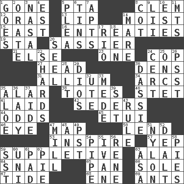 ACROSS 1. Went 5. Parent Teacher Association (abbr.) 8. Clement's nick name 12. Mouths or openings 13. Mouth edge 14. Damp 15. Compass direction 16. Pleas 19. R.R. building 20. More impudent 21. Otherwise 23. Single 24. Police officer (slang) 27. Froth on beer 30. Lairs 31. Plant genus of onion and garlic 34. Curves 35. Having or resembling wings 38. Lugs 40. Proofreading order 41. Put down 42. Spring feasts 44. Probability 45. Needle holder 46. Sight organ 47. Atlas unit 50. Grant temporary use of 53. Heighten or intensify 57. Slangy assent 59. Supplying deficiencies 63. Mountain range southwest of Kyrgyzstan 64. Slow-paced one 65. Baking dish 66. Not divided or shared with others 67. Event that recurs at intervals 68. Compass dir. 69. Pismires DOWN 1. Moves 2. Speak pompously 3. Rhinal 4. Eastern Standard Time (abbr.) 5. Entreaty 6. Airtight sealed metal containers 7. Flats, for short 8. Small bed 9. Cards in a Roman deck? 10. Compass dir. 11. Mountains (abbr.) 14. Female horse 17. _ de Janeiro 18. Car or cant ending 20. Stitch closed the eyes of (a falcon) 22. Pottery fragments 24. Foregone conclusion 25. Single time 26. Inconspicuous attention getter 28. The first octave above the treble staff 29. "Vaya con ____" 30. Hyrax 32. Shoshoni 33. Ancient Persian 35. Medicinal plant 36. Kenny Rogers chart-topper in '80 37. Assistant 39. Arrange properly for use 43. General guideline 47. Place where flour is made 48. A saturated hydrocarbon 49. Pacific Standard Time (abbr.) 51. Thermoplastic polyamide 52. Started a card game 54. Corncob 55. "Terrible" tsar 56. French philosopher Descartes 58. Sliced desserts 59. Fast jet (abbr.) 60. University (slang) 61. Groovy apt. 62. Sliced dessert 63. White ___ sheet