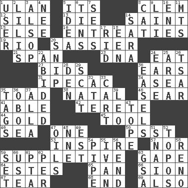 ACROSS 1. ____ Bator 5. ___ a Wonderful Life 8. Clement's nick name 12. Filth; sediment 13. Pass on 14. Virtuous person 15. Otherwise 16. Pleas 19. _ de Janeiro 20. More impudent 21. Connect, as a bridge 23. Heredity factor (abbr.) 24. Erode 27. Auction offers 30. Hearing organs 31. Medicinal drug used to evoke vomiting 34. At sea 35. Frog relative 38. Relating to or accompanying birth 40. Scorch 41. Competent 42. Cylindrical with tapered ends 44. Aureate 45. Utensil 46. Ocean 47. Single 50. Inconspicuous attention getter 53. Heighten or intensify 57. And not 59. Supplying deficiencies 63. Yawn 64. _____ Park, CO 65. Baking dish 66. The Jewish people; Israel 67. Lacerate 68. Conclusion 69. In addition DOWN 1. One who uses or employs something 2. Ms. Damita and namesakes 3. Columnist Joseph or Stewart 4. Born 5. The main thing one is thinking about 6. Airtight sealed metal containers 7. Arranges properly for use 8. Feline 9. Cards in a Roman deck? 10. Compass dir. 11. Mountains (abbr.) 14. "Two Mules for Sister ____" 17. To free from 18. Car or cant ending 20. Sever or remove by pinching or nipping 22. Remained 24. Relaxation 25. Length times width 26. Russian ruler of old 28. Lair 29. Scram! 30. Artist's stands 32. Had dinner 33. Haul 35. Labels 36. Mitch Miller's instrument 37. Silent film actress Nazimova 39. Lion 43. Drink excessively 47. Lubricates 48. Compass dir. 49. Eastern Standard Time (abbr.) 51. Slow-paced one 52. Traditional theme or motif 54. Corncob 55. _ the terrible 56. Tear apart 58. Former U.S. Attorney General Janet 59. Put into a specified state 60. Purpose 61. Parent Teacher Association (abbr.) 62. For each 63. Girls' org. (abbr.)